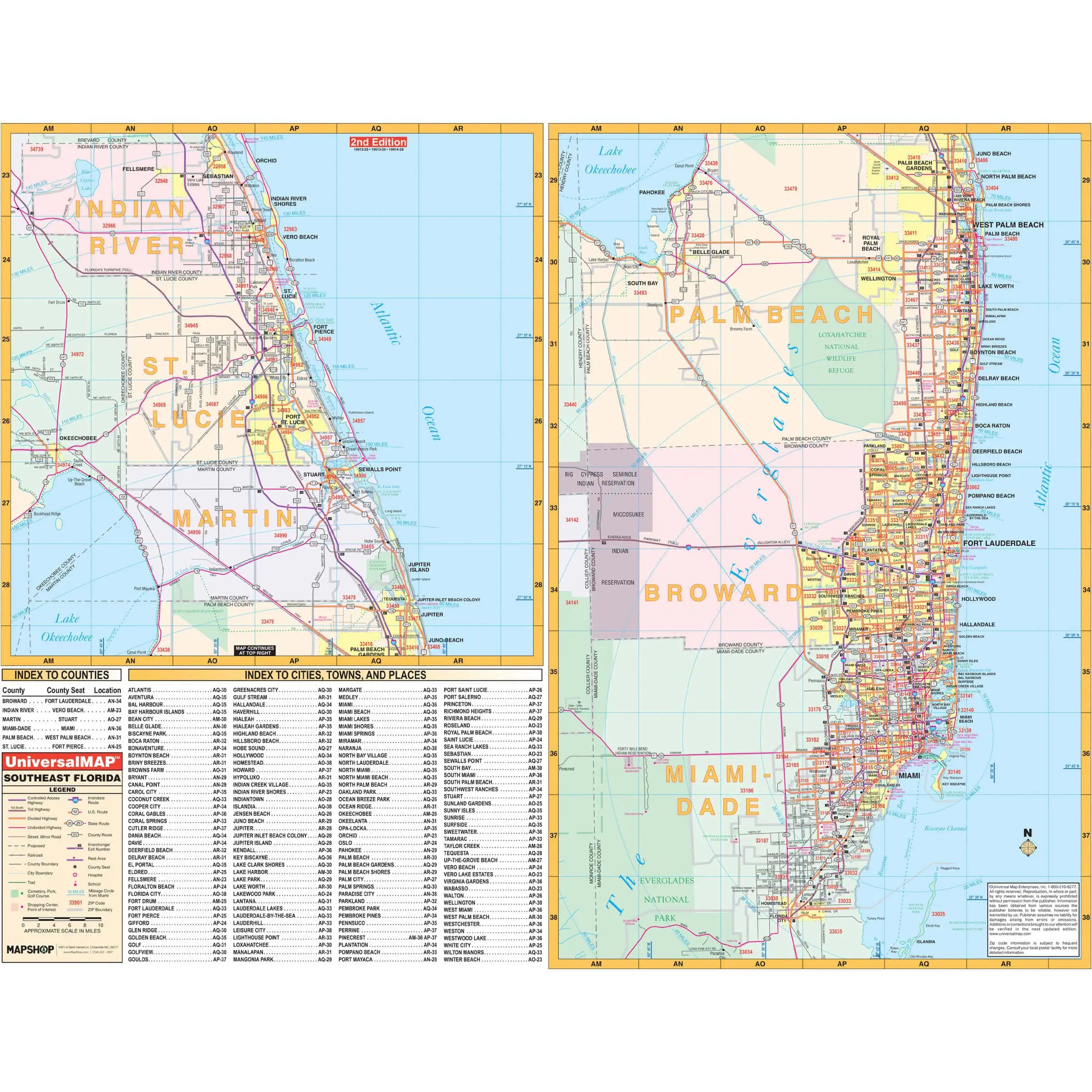 On the left side of the map, there is an index to counties, providing a quick reference to their geographic locations on the map. Adjacent to this is a detailed index to cities, towns, and places, which aligns with the grid overlay on the map to assist in pinpointing locations. The right panel of the map provides a close-up view of Palm Beach, Broward, and Miami-Dade counties, showing a higher concentration of roadways and urban development. This map serves as a resource for navigation, planning, and gaining a greater understanding of Southeast Florida’s geographical layout.