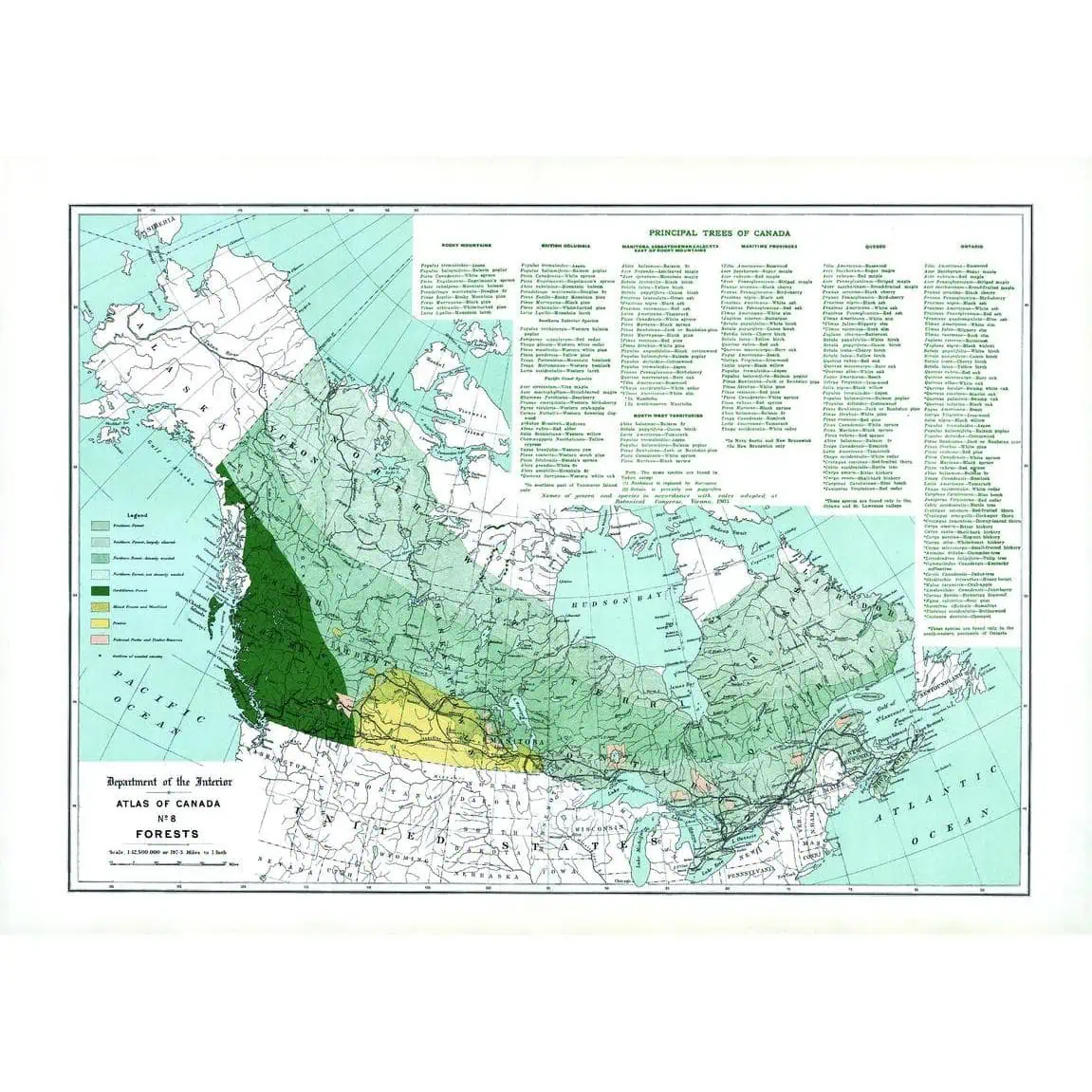 Contained within the 1st Edition (1906) of the Atlas of Canada is a map that shows the extent of forested regions, using tints of green, in Canada circa 1906. These regions include the Southern forest, Northern forest, and the Cordilleran forest. The map presents general portions of forested areas across the country which has been generally cleared of timber. Displayed is the section of Northern Forest that are less densely wooded; mixed prairie and woodland; Prairie; National Parks and Forest Reserves of the Dominion. There are also lists, by province, of the principal trees of Canada, in addition to notes of when distribution is confined to a comparatively small portion of the area of the province. The map also includes major cities, rivers, major bodies of water, and some railway systems. 24 x 17.25 in