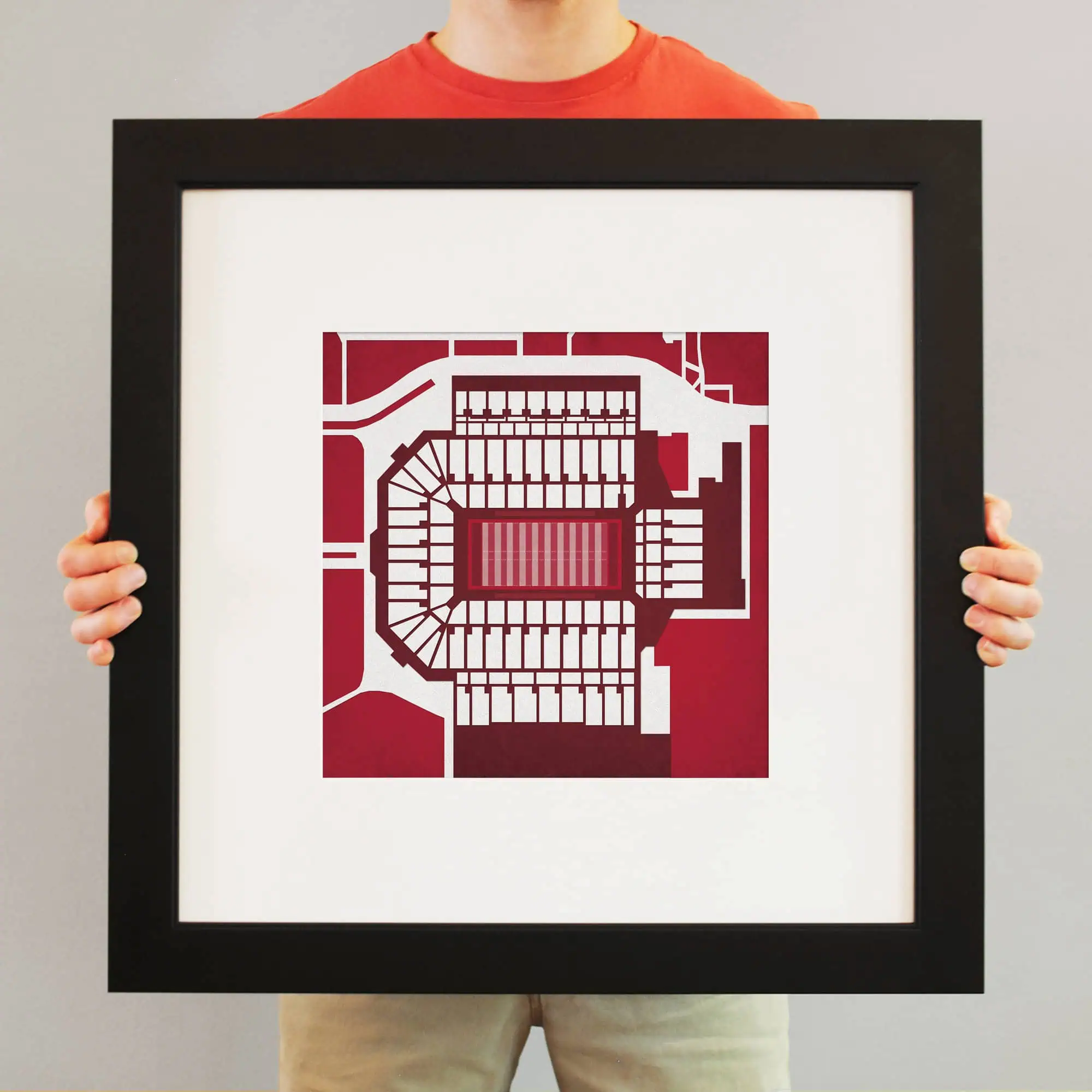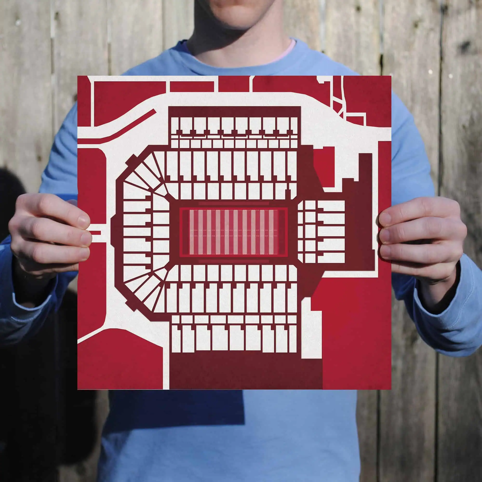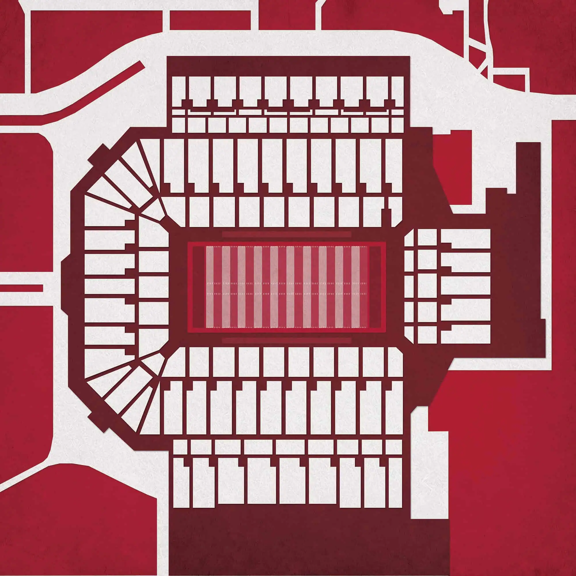 Map art print including the aerial view of Gaylord Family Oklahoma Memorial Stadium located at The University of Oklahoma in Norman, Oklahoma.
