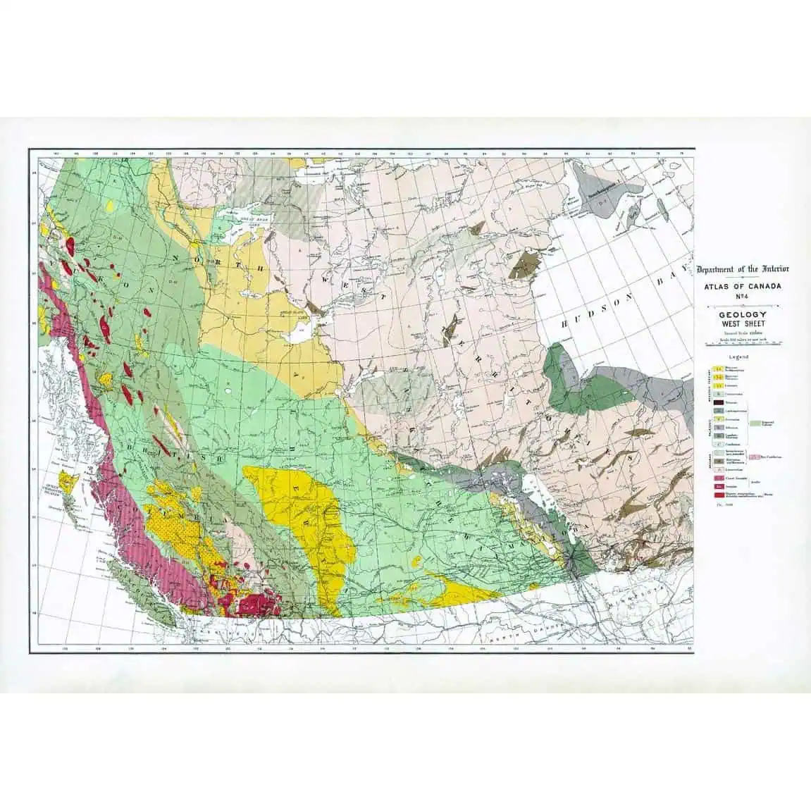 Contained within the 1st Edition (1906) of the Atlas of Canada is a map that shows the geology and bedrock for Western Canada. The rock type era and period of formation are represented as letter codes and colour, in addition to indicating the surface coverage. The map emphasizes the extensive area in the Dominion that is occupied by the Archaean nucleus. It also includes major cities and railway systems. 24 x 17.25 in