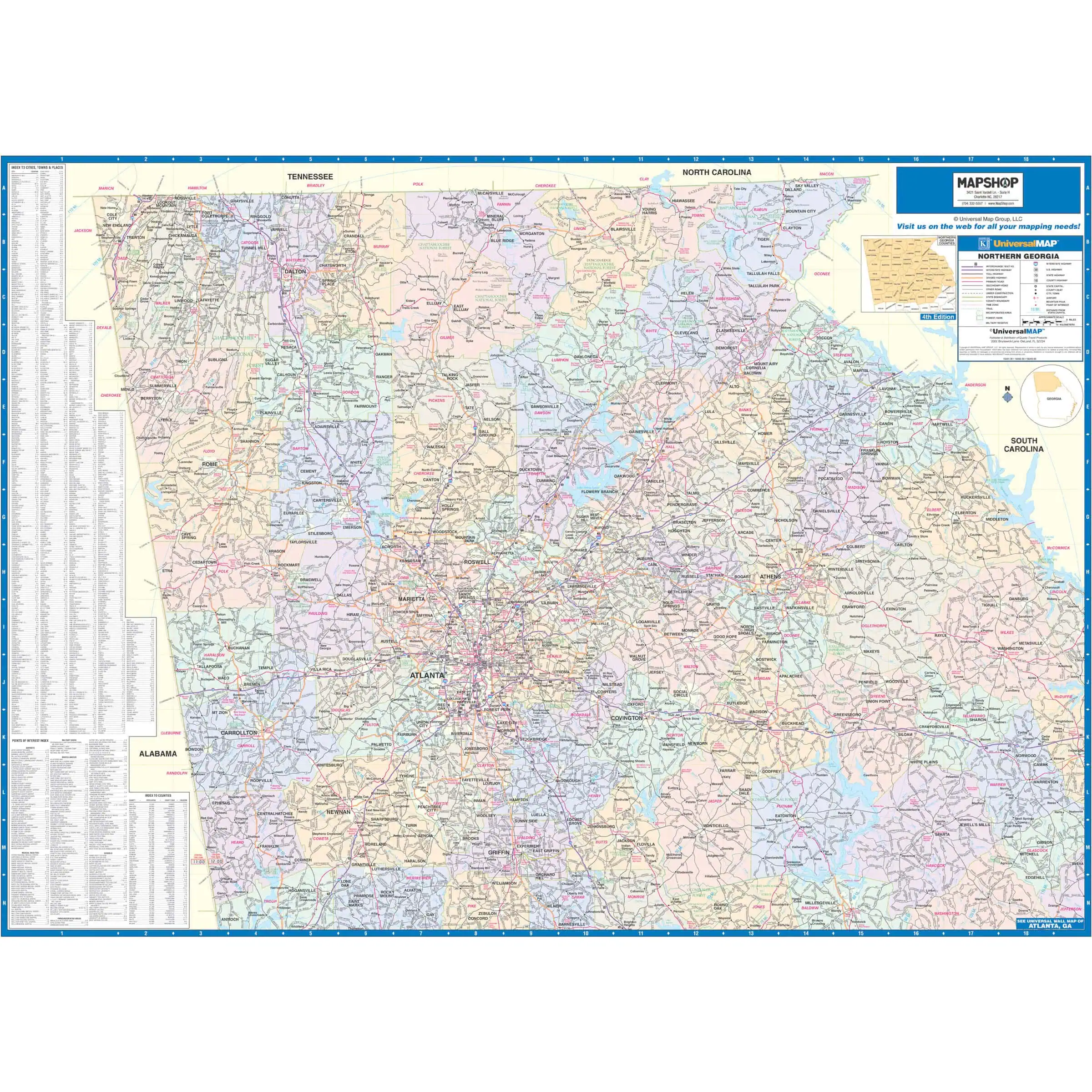 This northern Georgia wall map covers the full corridor from metro Atlanta through the Blue Ridge Mountains, extending north to the Tennessee and North Carolina state lines. Western coverage reaches the Alabama border, while the eastern boundary follows the South Carolina state line.