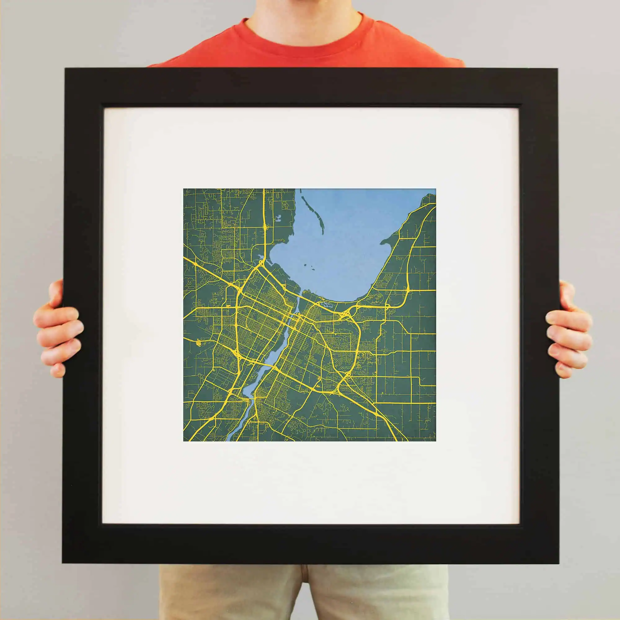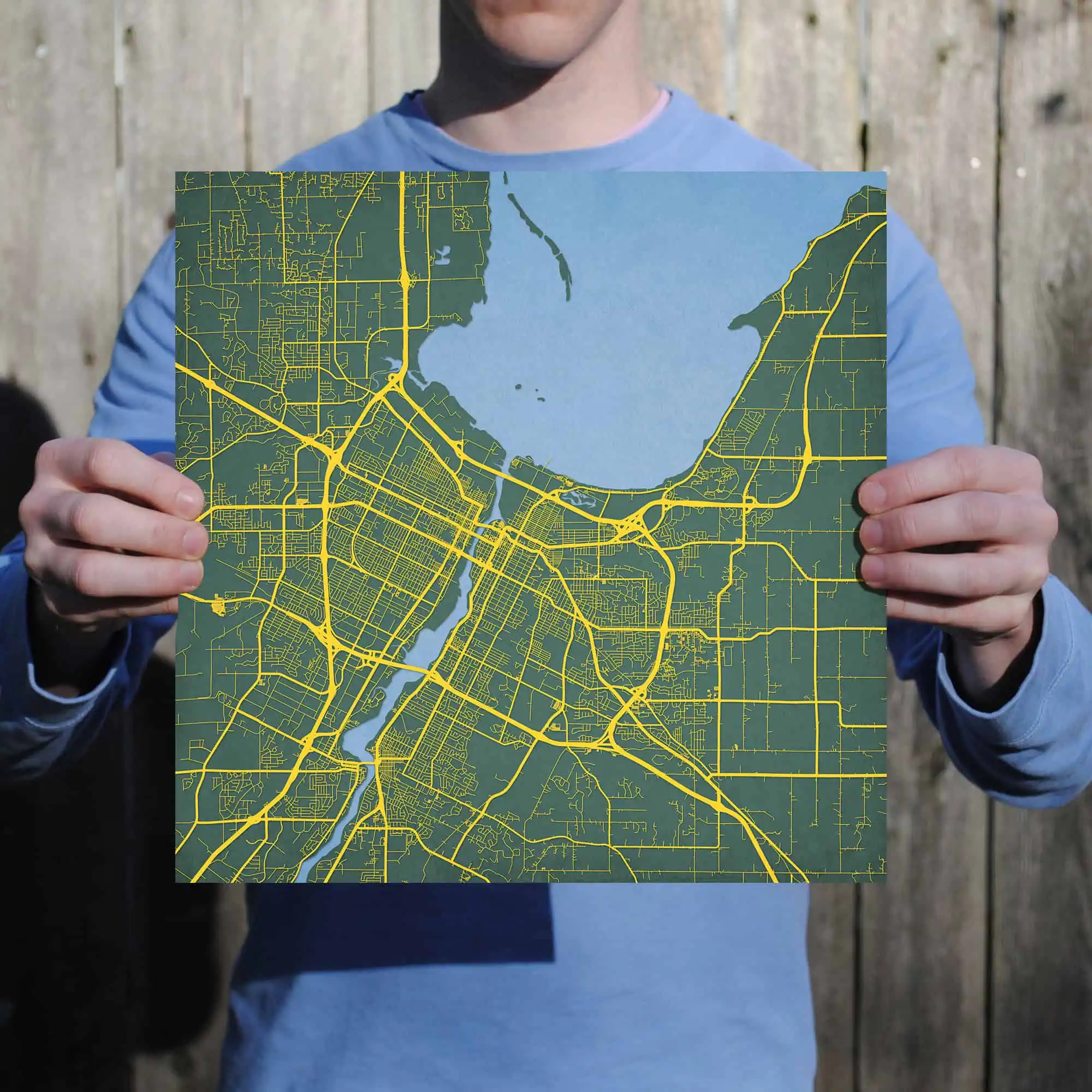 Colorful city map wall art featuring prominent street layouts and urban design, perfect for home or office decor, highlighting city navigation and geographic features.