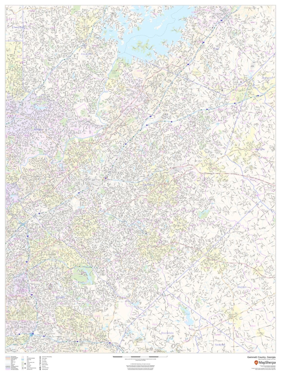 This map of Gwinnett County, Georgia shows regional level information. Base map features include highways and major roads with labelling; neighborhood names; railways; high level land use such as parks and recreation areas, industrial areas and hospital campuses; and a selection of points of interest including transportation hubs like airports and train stations, tourist information, police stations and shopping centres. ZIP code boundaries are shown as a secondary map feature.