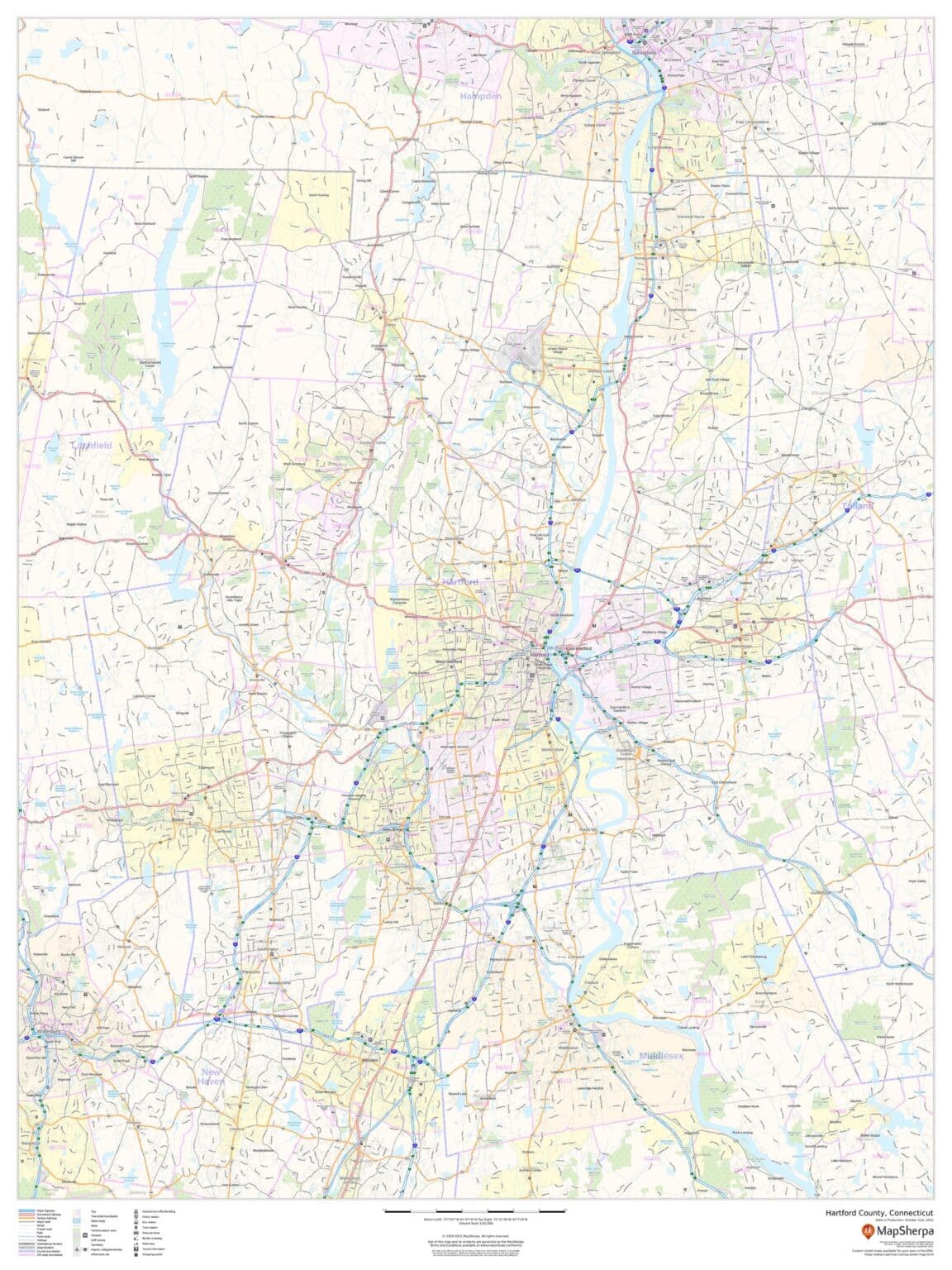 This map of Hartford County, Connecticut regional level information. Base map features include highways and major roads with labelling; neighborhood names; railways; high level land use such as parks and recreation areas, industrial areas and hospital campuses; and a selection of points of interest including transportation hubs like airports and train stations, tourist information, police stations and shopping centres. ZIP code boundaries are shown as a secondary map feature.