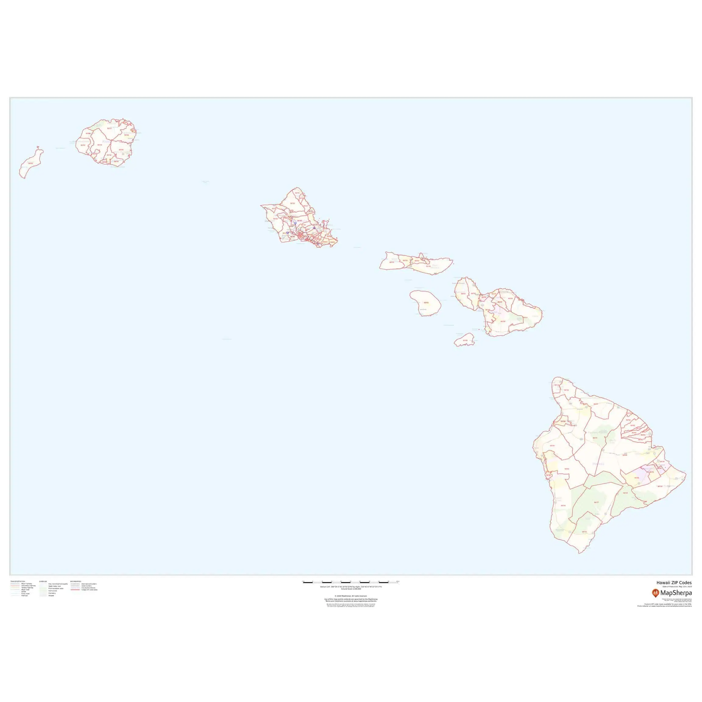 This map of Hawaii shows zip codes overlaid on a road map. Base map features include municipality and county boundaries, major road network features, and state and national parks and conservation areas.