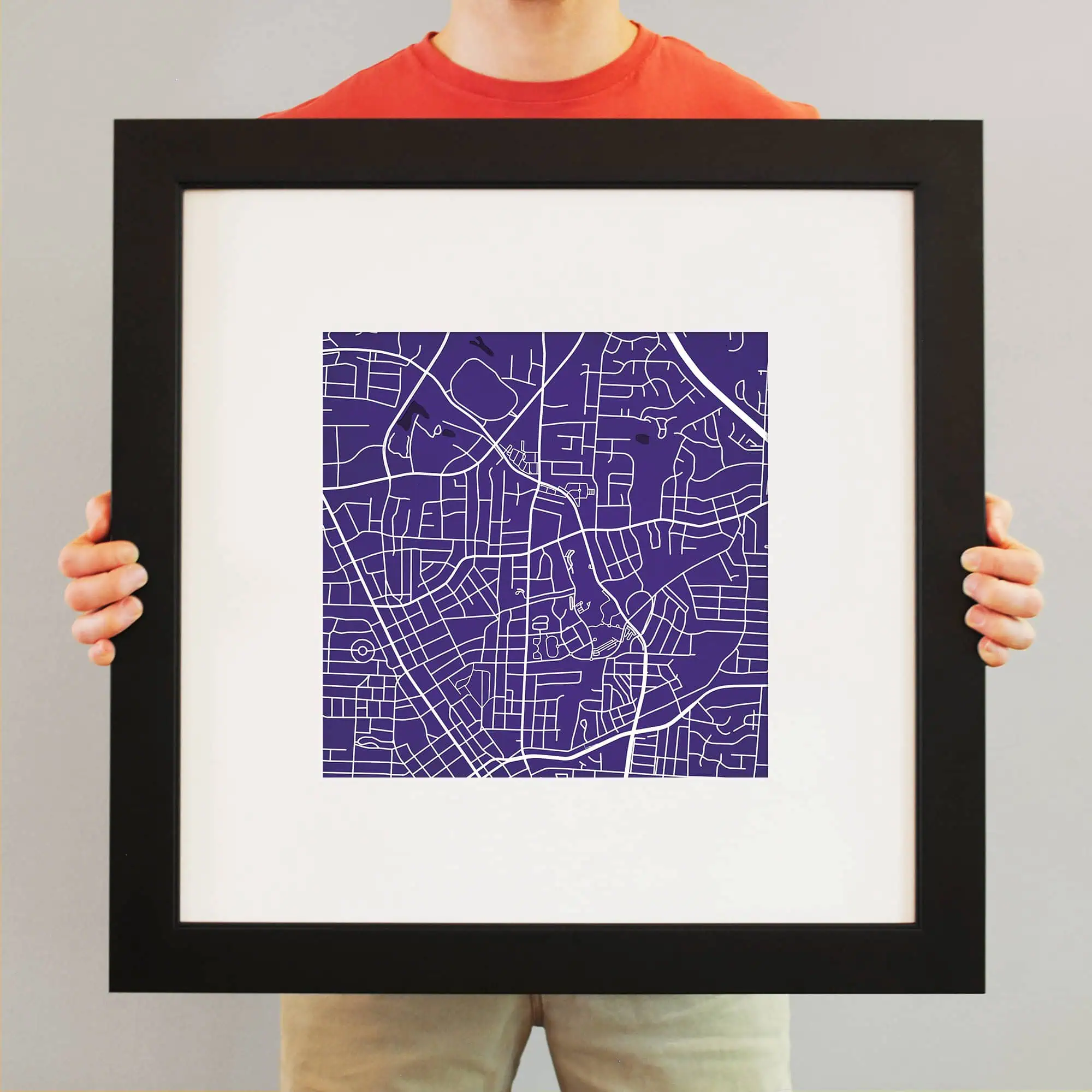 The size of this frame will vary depending on the size of the map you created. Frames are 23″ x 23″ for 12″ x 12″ prints and frames are 15.75″ x 19.75″ for 12″ x 16″ maps. Both frames have a black 1.75” wide genuine-wood molding. The print is enhanced with a soft white acid-free mat, which is bevel cut and placed on top of the print. The print and matt are protected by a premium crystal-clear acrylic overlay. The back of the frame is sealed with a dust cover for added protection. Industrial silver hanging hardware is bolted to the back of the frame so it’s ready to hang on your wall.