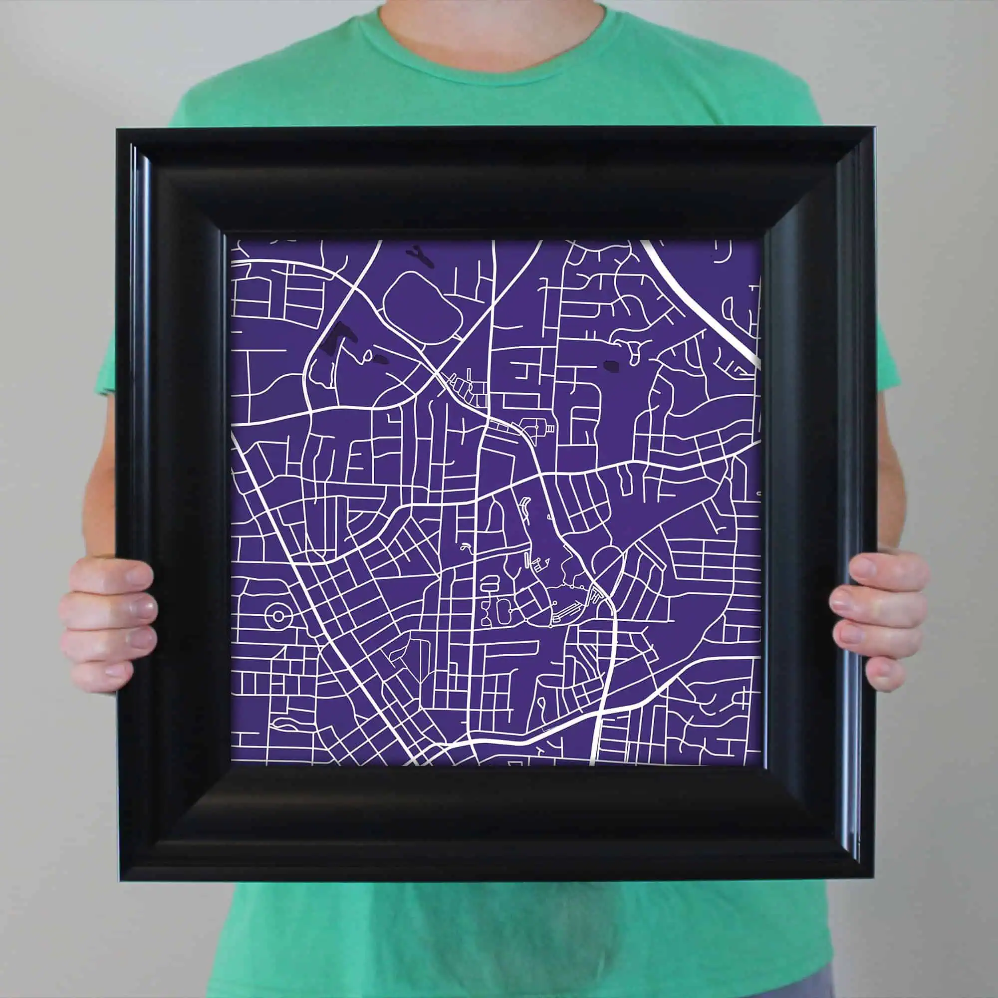 The size of this frame will vary depending on the size of the map you created. Frames are 16.5″ x 16.5″ for 12″ x 12″ prints and frames are 16.5″ x 20.5″ for 12″ x 16″ maps. Our frames have a black 2.75” wide heavy polystyrene molding. We choose to mount the prints without a glass/acrylic overlay, which shows off the unique properties of our paper stock when it hits the light. The back of the frame is sealed with a dust cover for added protection. Industrial silver hanging hardware is fixed to the back of the frame so it’s ready to hang on your wall.