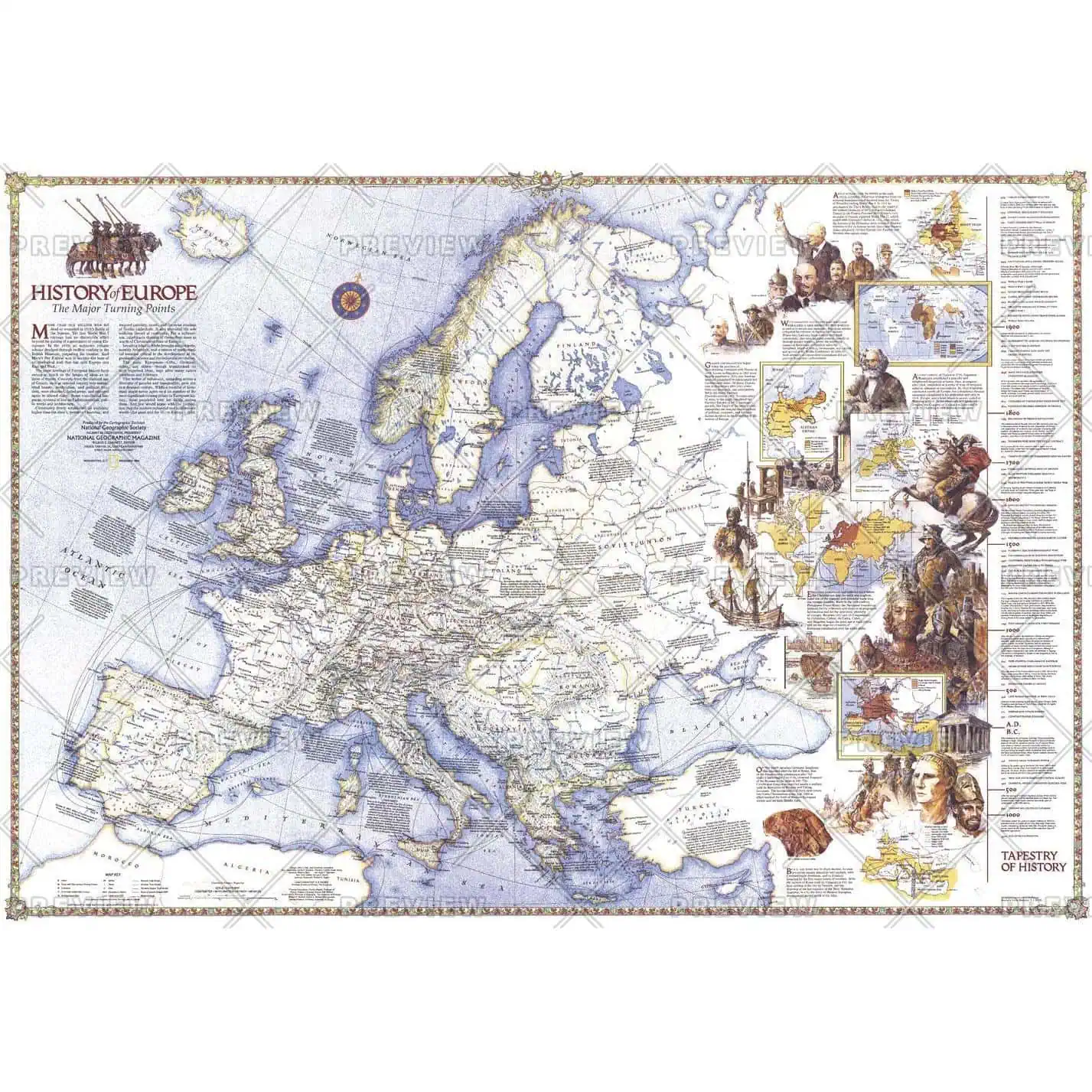 Travel through time with this map as it explores the major turning points in European history. Features dazzling illustrations and multiple inset maps. Published in December 1983 as a companion to the “Europe” map and four articles including “Rome of the East.”