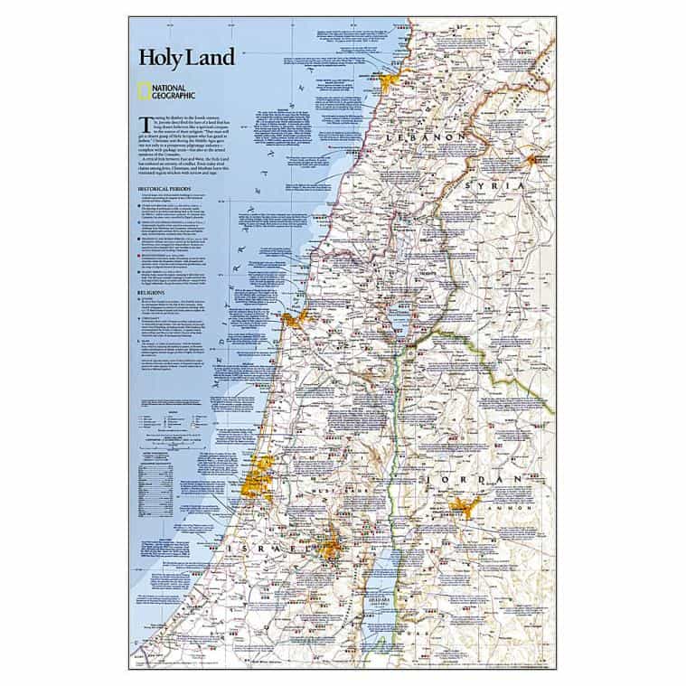 National Geographic’s Holy Land wall map provides a fascinating in-depth look at the faiths, peoples, and politics that have shaped this historic region. This detailed political map is overlayed with facts about significant religious sites. Information on Judaism, Christianity, and Islam, as well as historical periods from the Stone and Bronze ages to the Islamic period through 1917 make this as much an educational tool as an attractive work of cartographic art.