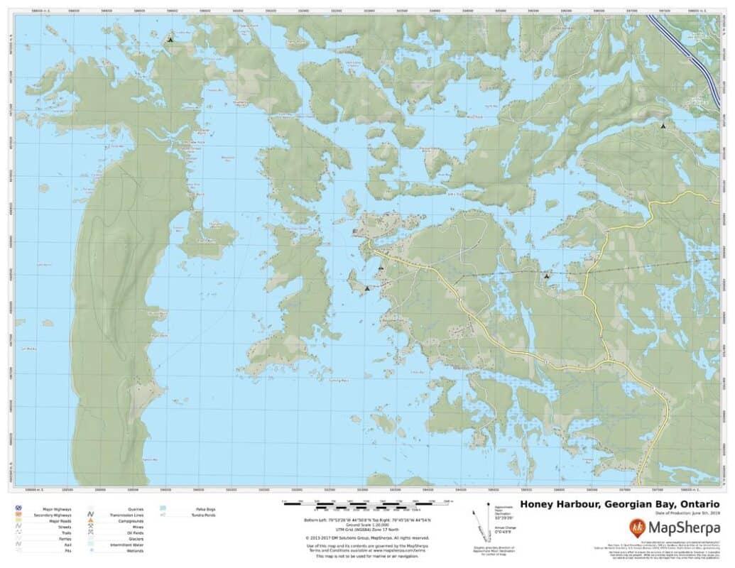 A cartographically beautiful map of Honey Harbour, Georgian Bay, Ontario ideal for showing off cottages, resorts, lakes and other favourite places.