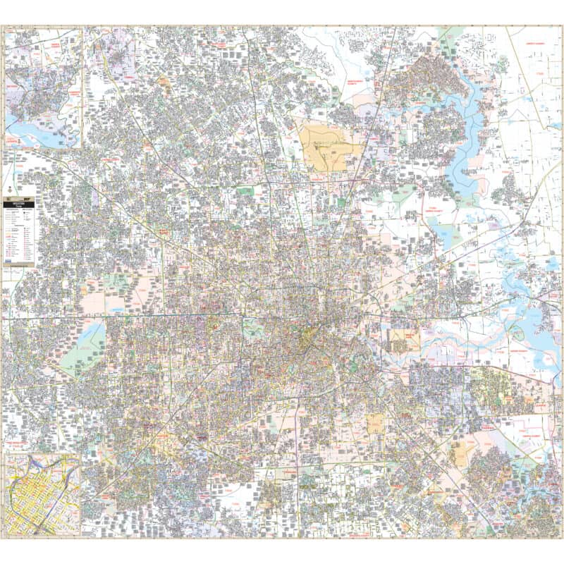The Houston, TX Wall Map, with adjacent areas, offers complete street detail at a scale of 1″ = 3,167 feet. The area of coverage includes the following boundaries: