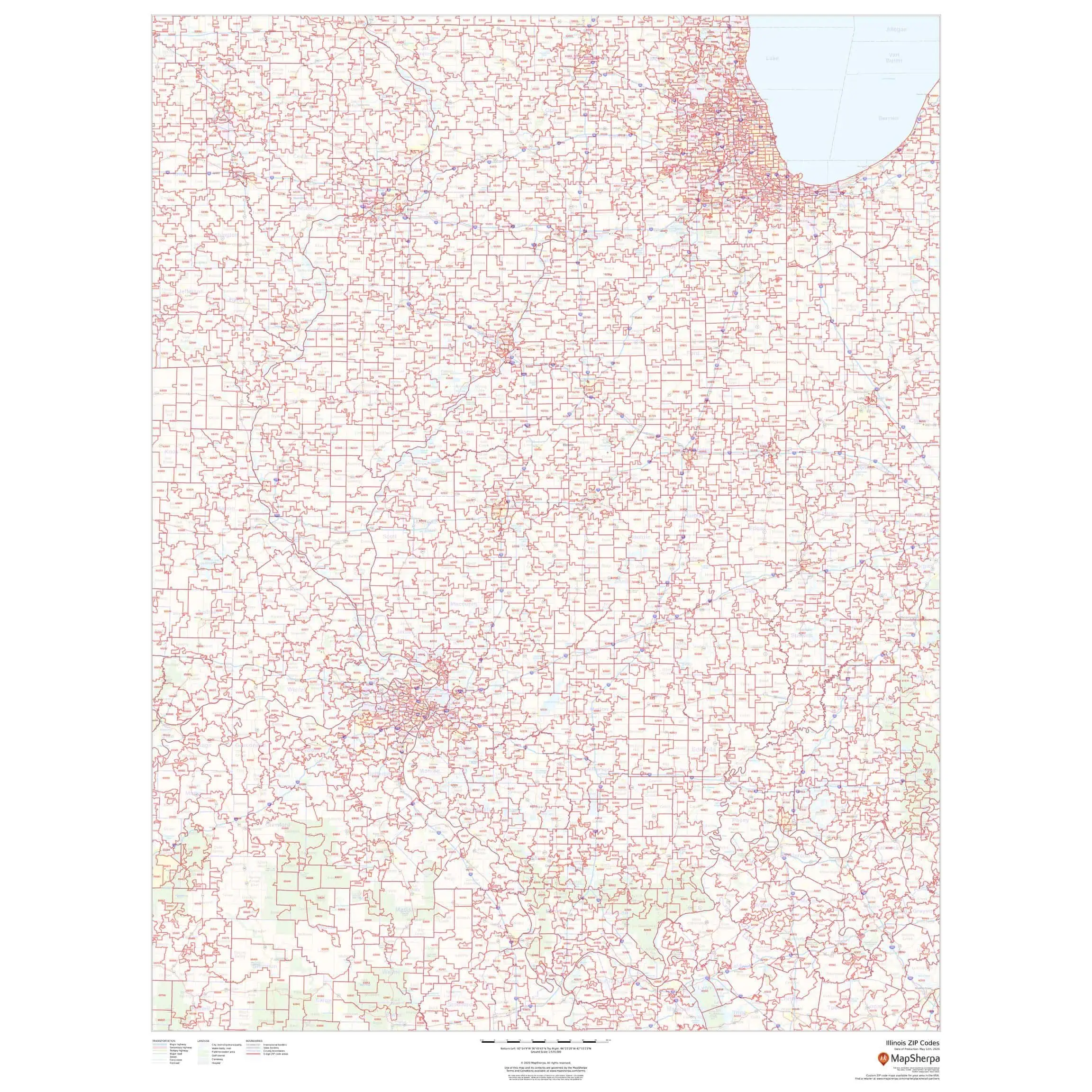 This map of Illinois shows zip codes overlaid on a road map. Base map features include municipality and county boundaries, major road network features, and state and national parks and conservation areas.