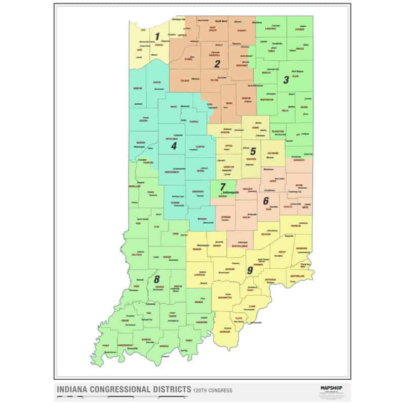 Built on the latest redistricting data for the 2026 election cycle, this is one of the most current Indiana congressional maps available. Produced and sold exclusively by Map Shop.