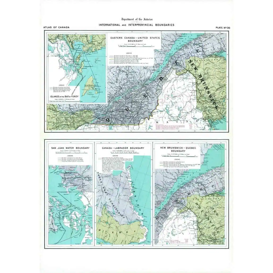 Contained within the 1st Edition (1906) of the Atlas of Canada is a plate that shows five maps illustrating international and interprovincial boundary claims. Two show the Quebec – New Brunswick – Maine area, and another displays the Canada – Labrador boundary. There are two small maps showing offshore claims; one for the Bay of Fundy, and the other for the Gulf Islands (San Juan) in the Strait of Georgia. The Eastern Canada- United States boundary was commonly called the 'Marine boundary' from 1783 to 1842. There were still many disputes going on at the time, including jurisdiction of Newfoundland, the province of New Brunswick – Quebec and the United States, as well as Vancouver Island. The boundary indicating the Labrador coast was to be claimed by Canada. In addition, major railway systems displayed. 17.25 x 24.25 in