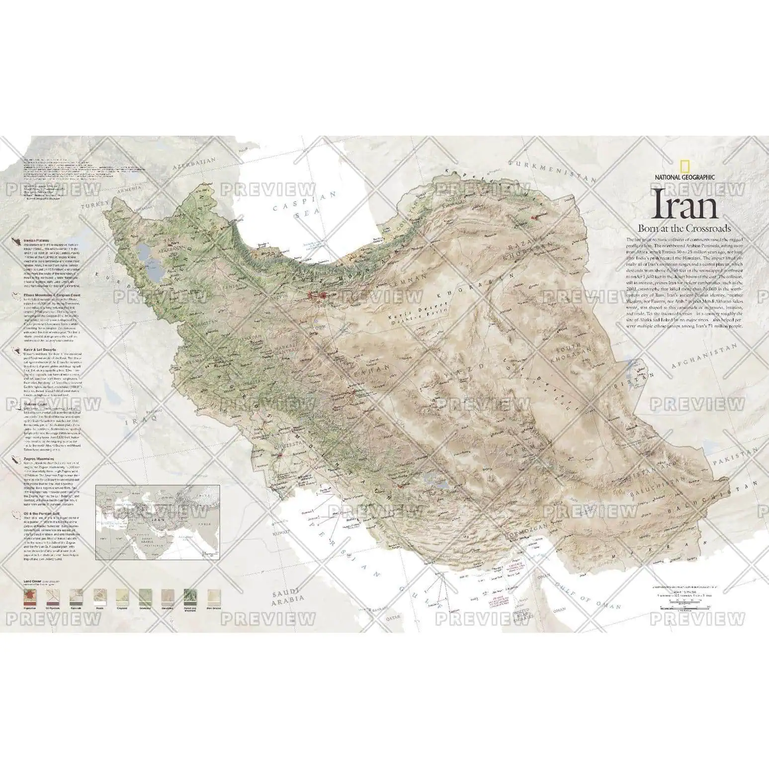 Iran’s diverse geography is revealed in this unique map. Information about the formation of the terrain combined with earth-tone colors and shaded relief present this compelling country in a way that demonstrates how its landscape has been so integral in the shaping of its history and culture. Published in August 2008, this map was half of a two-map set with “The Empire of Persia.”