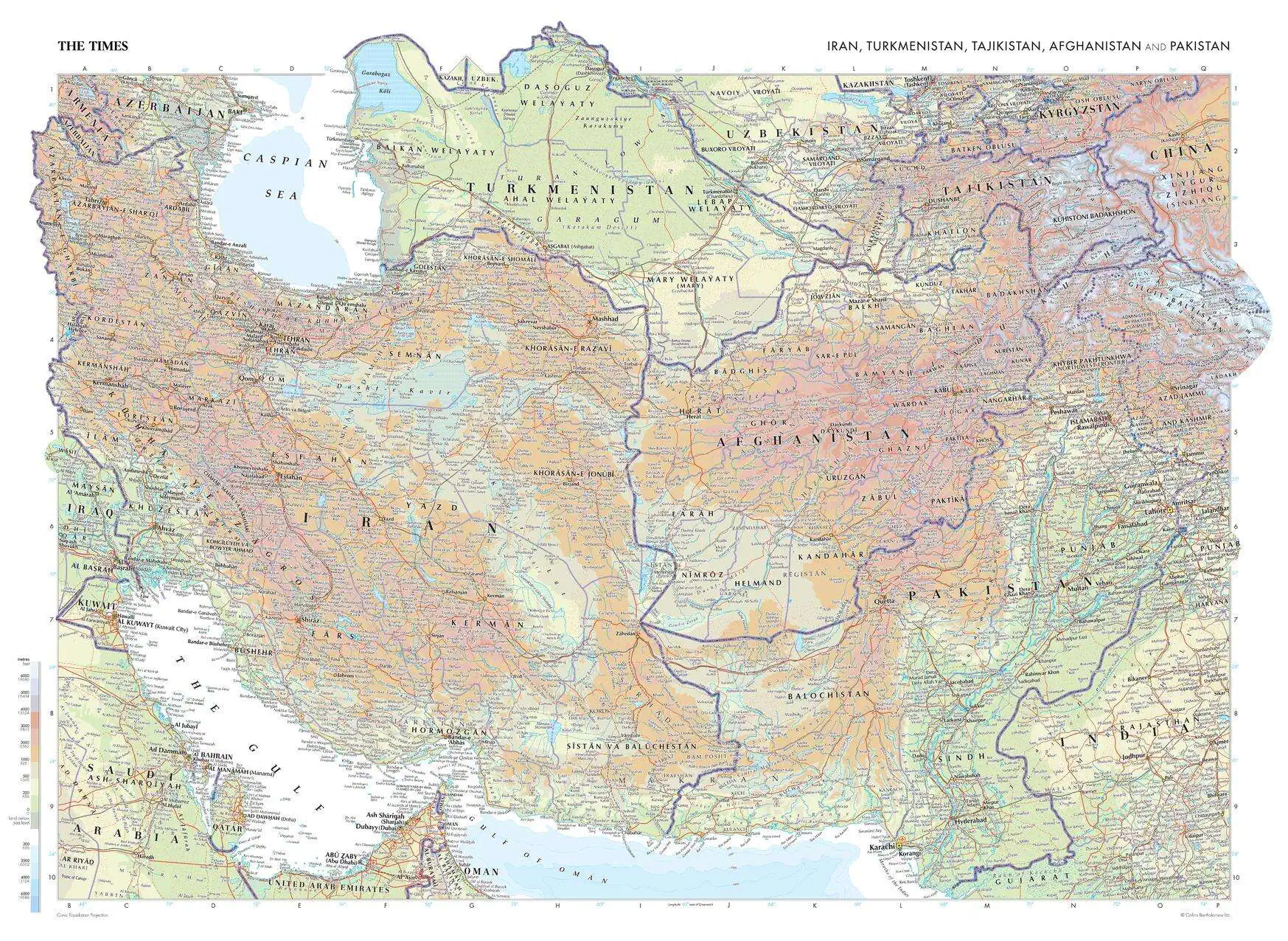 This map of Iran, Turkmenistan, Tajikistan, Afghanistan, and Pakistan stands as a benchmark of cartographic excellence, sourced from the industry-leading Times Comprehensive Atlas of the World. Published in full colour, this map offers a comprehensive and updated view of the landscapes that are found in this region. Prominent features such as the arid expanses of the Iranian Plateau, the rugged terrain of Afghanistan, and key cities such as Tehran, Kabul and Dubai are clearly identifiable. With meticulous attention to detail, this map is an indispensable guide to the geographic intricacies of Iran, Turkmenistan, Tajikistan, Afghanistan, and Pakistan.