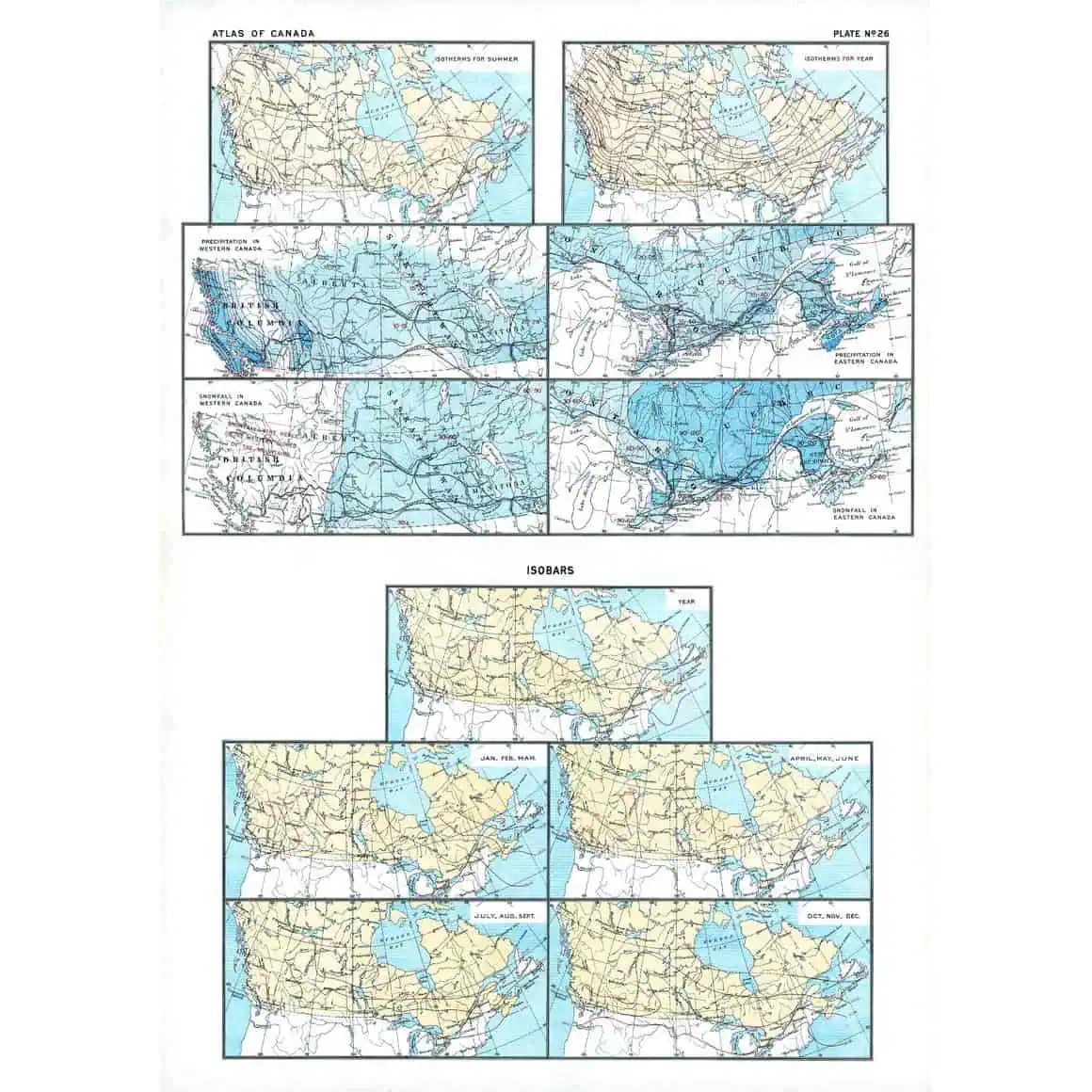 Contained within the 1st Edition (1906) of the Atlas of Canada is a plate that shows 11 maps. Two maps at the top of this plate presenting isothermal lines for summer and for the entire year. The isotherms for summer display the great northern "loop" of the summer isotherm of 55 degrees Fahrenheit, which make cultivation of cereals possible. The annual isothermal lines follow an easterly and Westerly direction which would obscure the beneficial effect indicated by the summer isotherms. The next four maps show precipitation and snowfall for Eastern and Western Canada in inches. The remaining five maps show isobaric lines. One map shows the annual average, while the other four cover seasons (January-March, April-June, July-September, and October-December). Barometric pressure is measured in inches of mercury. In some of the maps, major railway systems are shown. 17.25 x 24.25 in