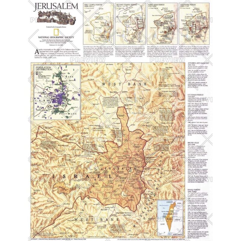 This thorough portrait of Jerusalem contains a brief history of the city, a historical timeline, maps of the various periods, and a modern look at this enigmatic holy place. Published in April 1996, this map accompanied the “Jerusalem: The Old City” map and the article “The Three Faces of Jerusalem.”Â