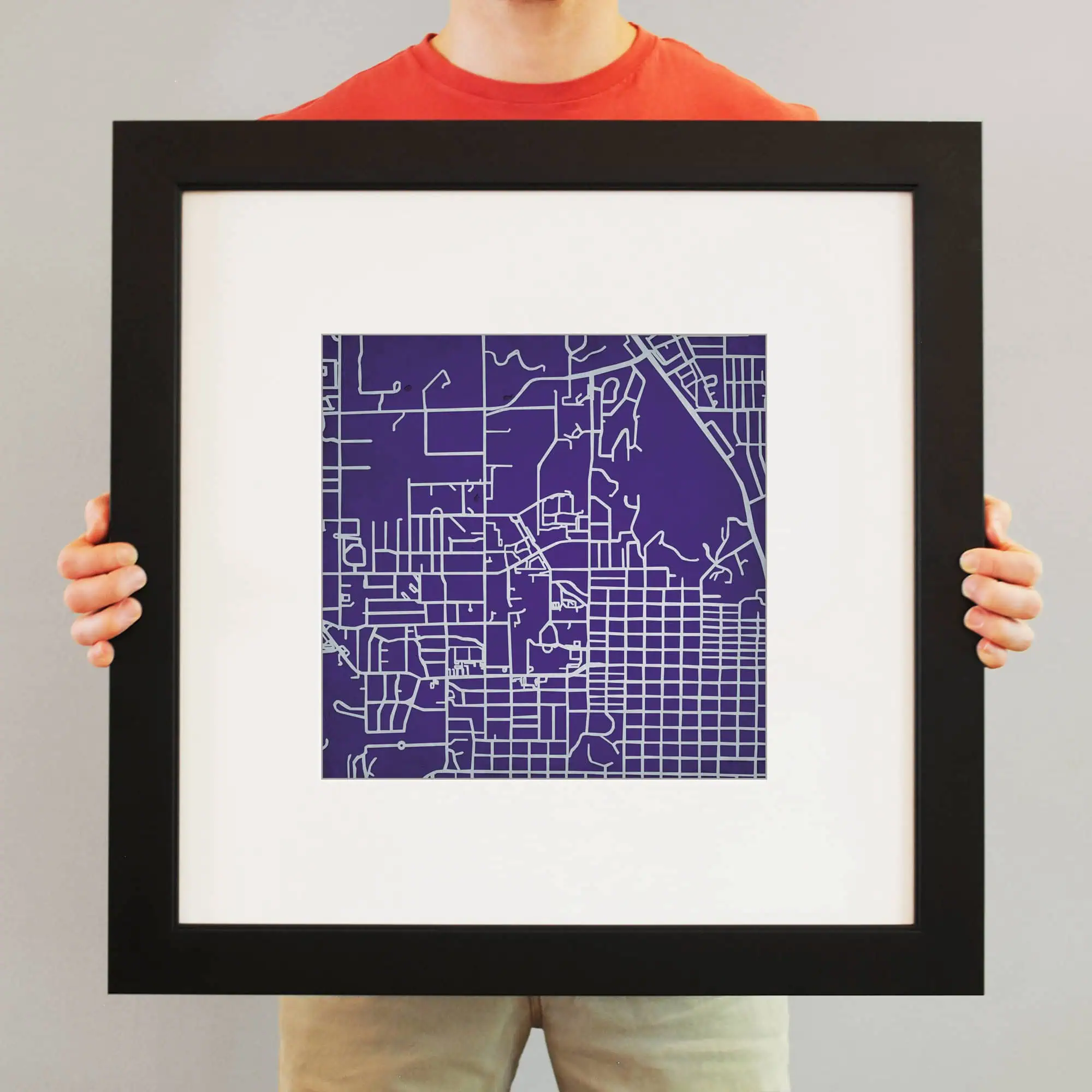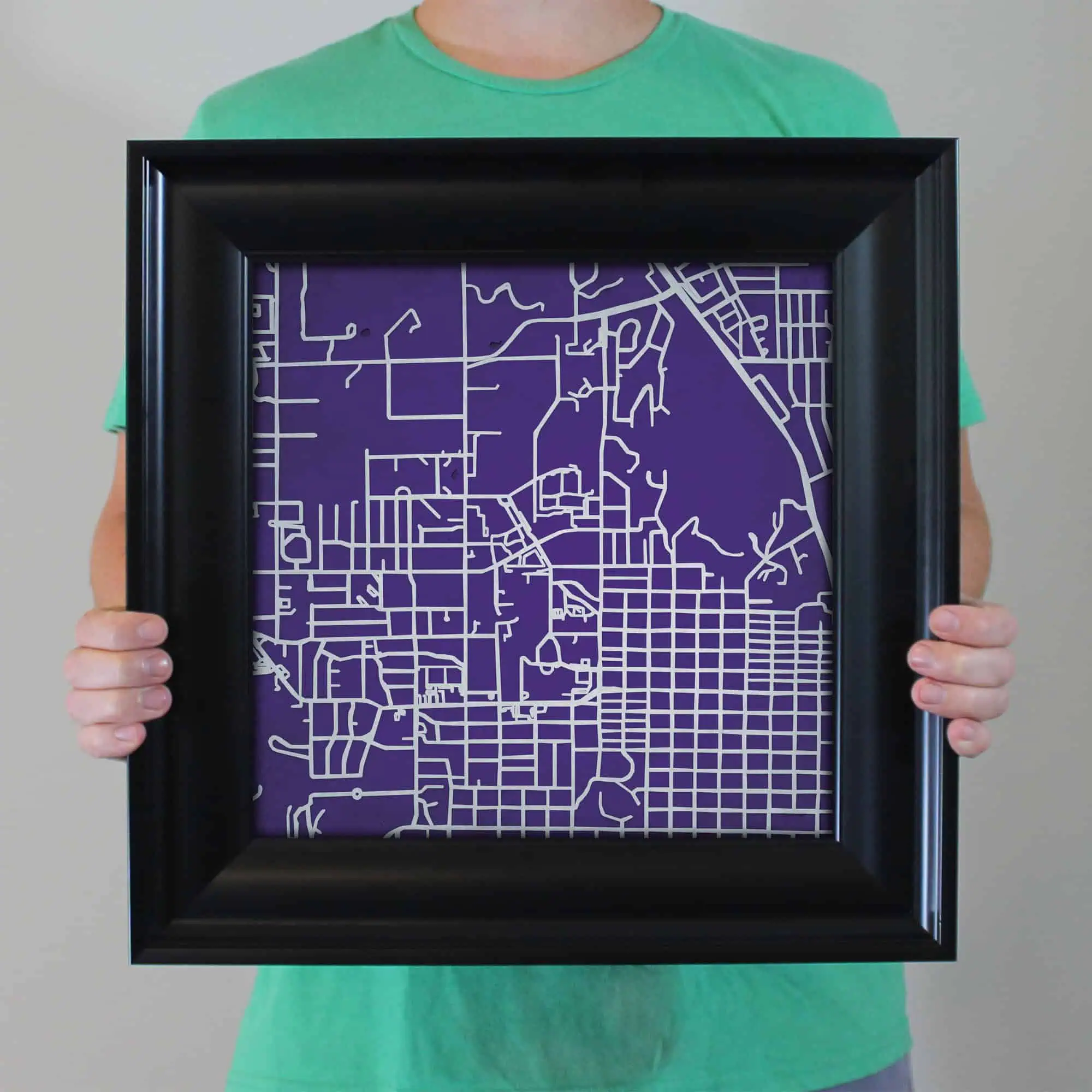 The size of this frame will vary depending on the size of the map you created. Frames are 16.5″ x 16.5″ for 12″ x 12″ prints and frames are 16.5″ x 20.5″ for 12″ x 16″ maps. Our frames have a black 2.75” wide heavy polystyrene molding. We choose to mount the prints without a glass/acrylic overlay, which shows off the unique properties of our paper stock when it hits the light. The back of the frame is sealed with a dust cover for added protection. Industrial silver hanging hardware is fixed to the back of the frame so it’s ready to hang on your wall.