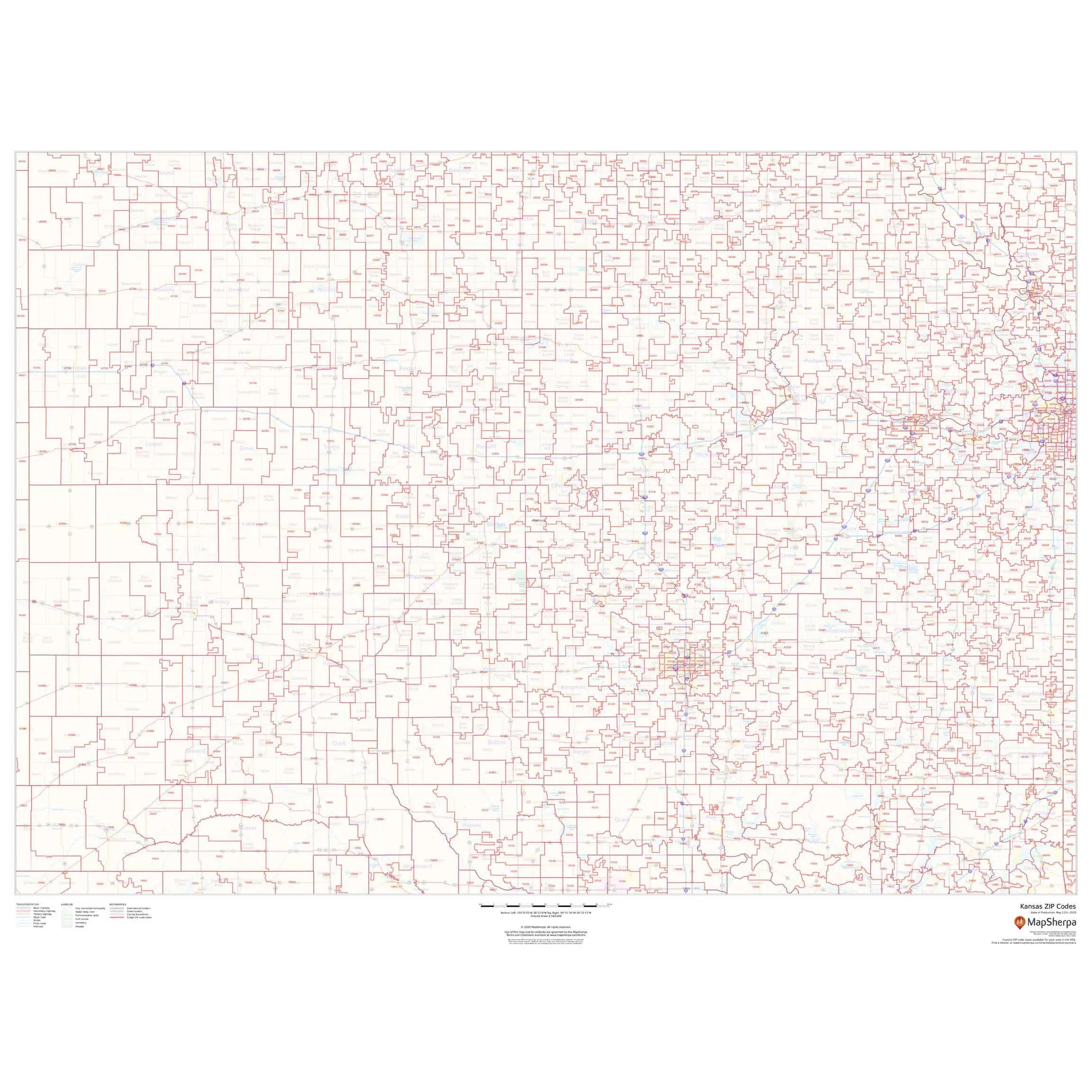 This map of Kansas shows zip codes overlaid on a road map. Base map features include municipality and county boundaries, major road network features, and state and national parks and conservation areas.