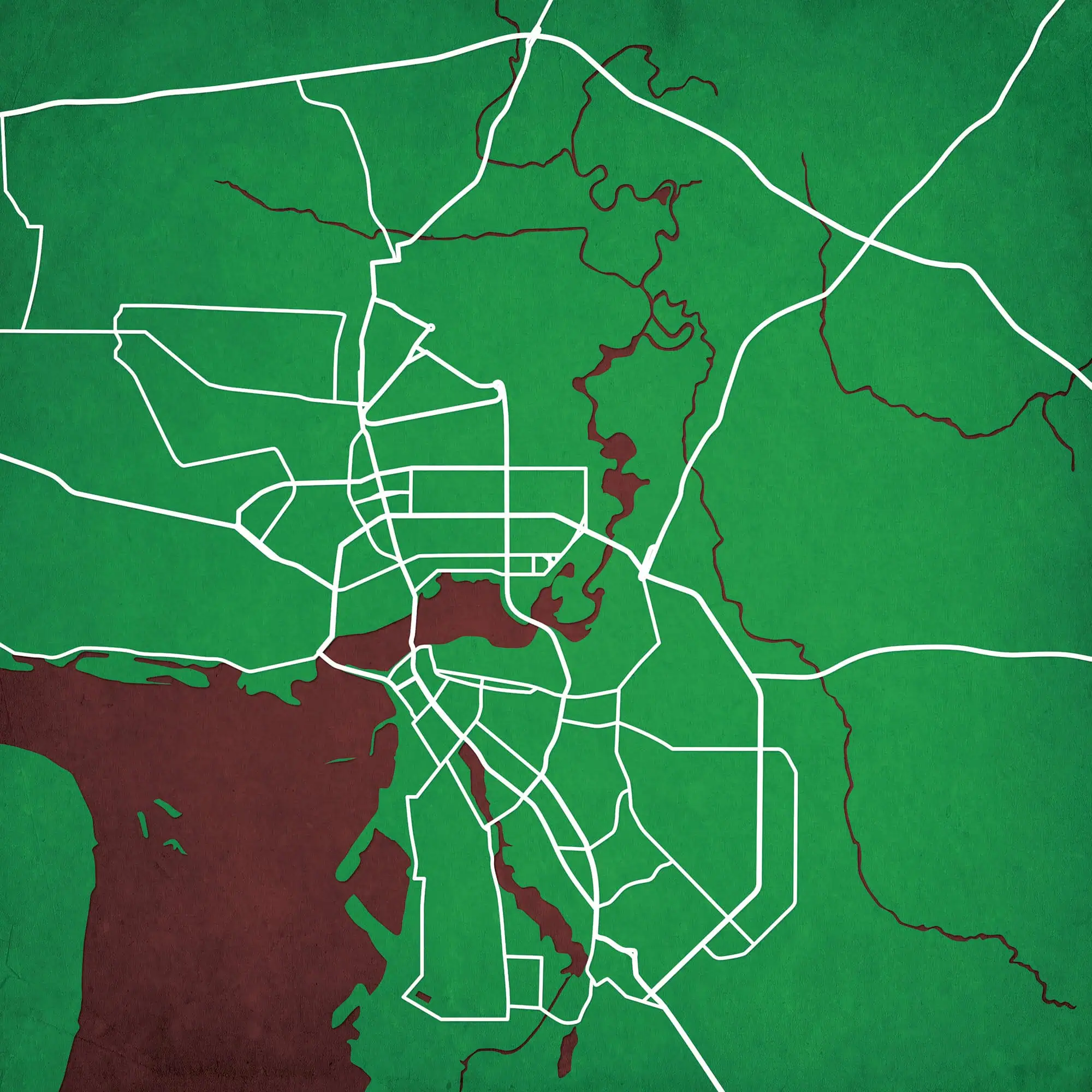 Colorful city map wall art featuring prominent street layouts and urban design, perfect for home or office decor, highlighting city navigation and geographic features.