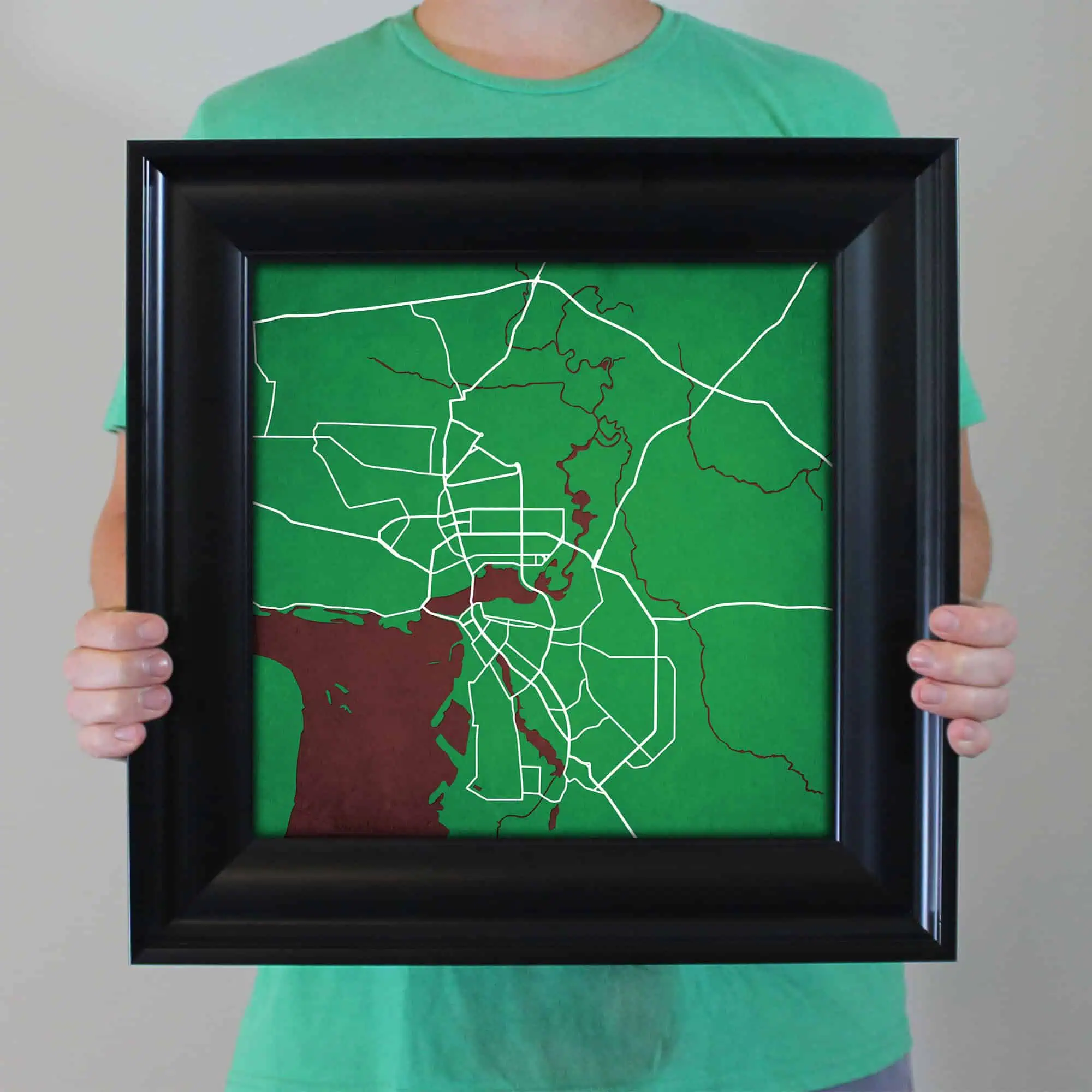 The size of this frame will vary depending on the size of the map you created. Frames are 16.5″ x 16.5″ for 12″ x 12″ prints and frames are 16.5″ x 20.5″ for 12″ x 16″ maps. Our frames have a black 2.75” wide heavy polystyrene molding. We choose to mount the prints without a glass/acrylic overlay, which shows off the unique properties of our paper stock when it hits the light. The back of the frame is sealed with a dust cover for added protection. Industrial silver hanging hardware is fixed to the back of the frame so it’s ready to hang on your wall.