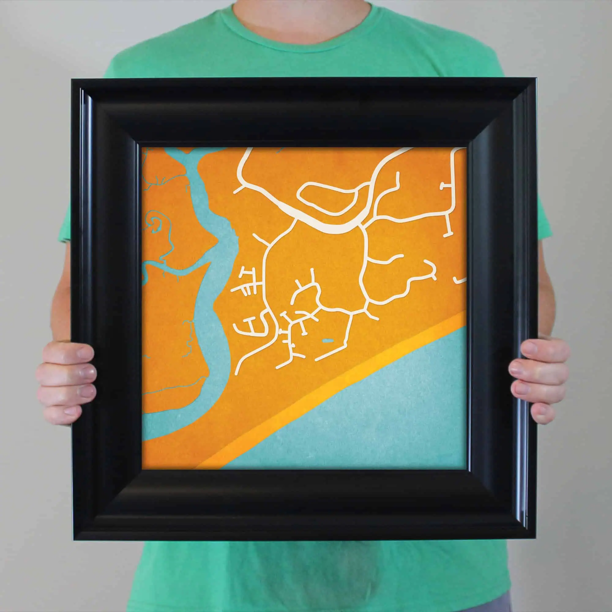The size of this frame will vary depending on the size of the map you created. Frames are 16.5″ x 16.5″ for 12″ x 12″ prints and frames are 16.5″ x 20.5″ for 12″ x 16″ maps. Our frames have a black 2.75” wide heavy polystyrene molding. We choose to mount the prints without a glass/acrylic overlay, which shows off the unique properties of our paper stock when it hits the light. The back of the frame is sealed with a dust cover for added protection. Industrial silver hanging hardware is fixed to the back of the frame so it’s ready to hang on your wall.