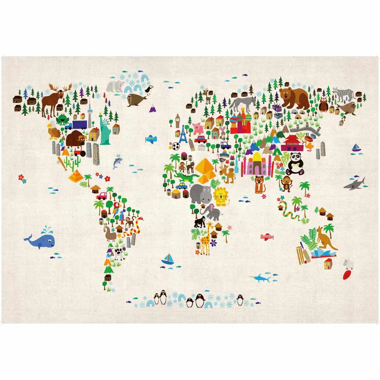 Colourful and vibrant map of the world made from animals.