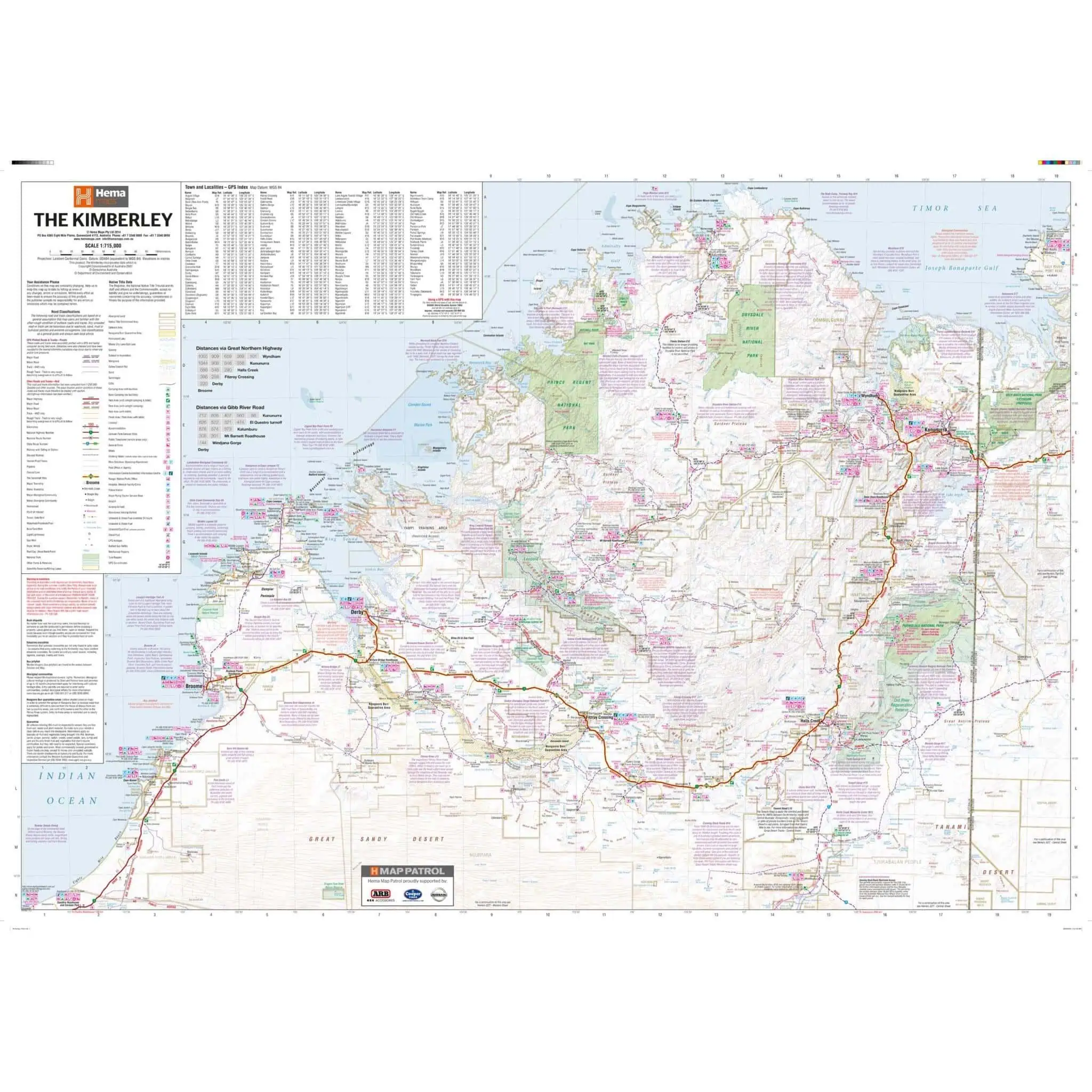 A large map of the Kimberley that features 4WD tracks, touring information, points of interest, facilities and distances, making it the perfect trip planning tool and reference map.Â