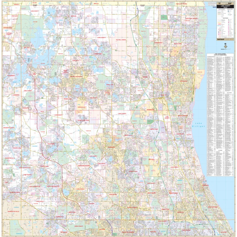 Explore the comprehensive Lake County, IL Wall Map, offering detailed street-level information across the entirety of Lake County and its adjacent areas. This map spans a vast area, featuring key boundaries that define its coverage: