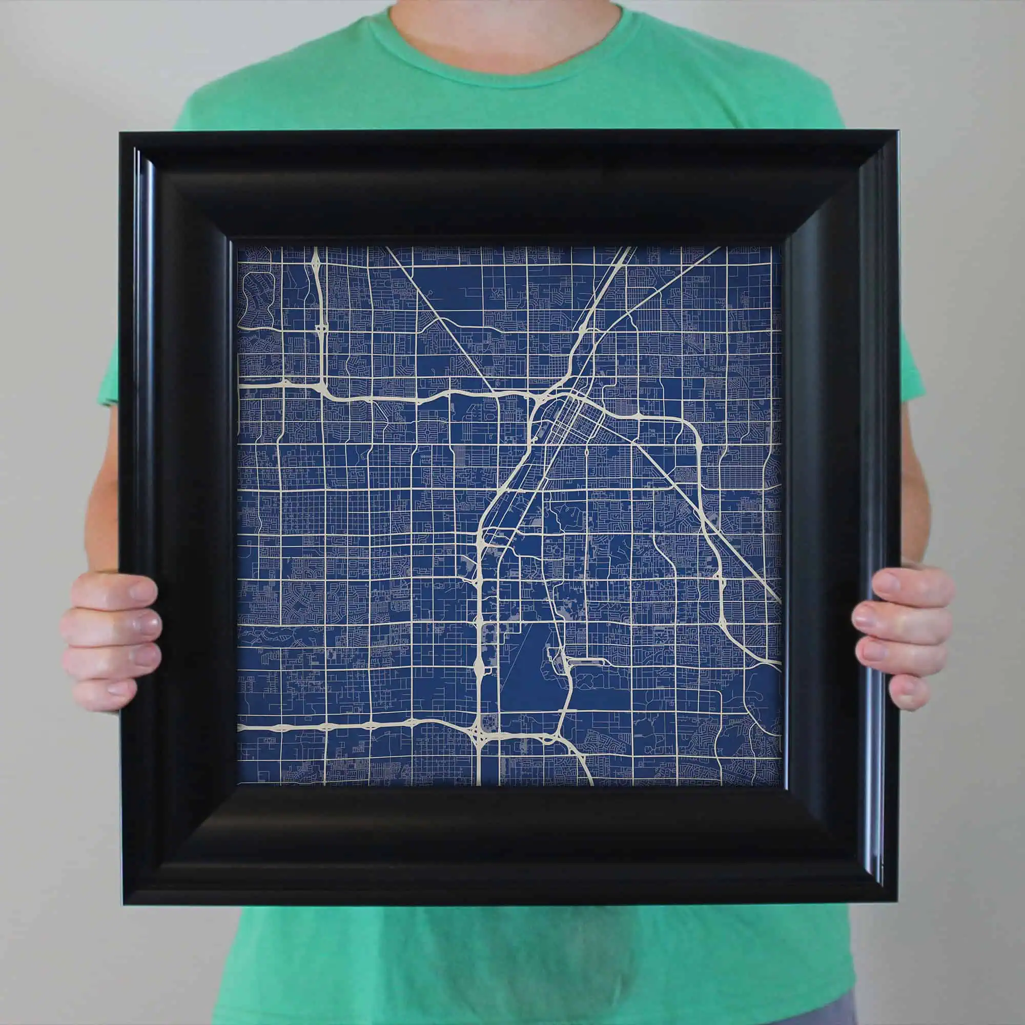 The size of this frame will vary depending on the size of the map you created. Frames are 16.5″ x 16.5″ for 12″ x 12″ prints and frames are 16.5″ x 20.5″ for 12″ x 16″ maps. Our frames have a black 2.75” wide heavy polystyrene molding. We choose to mount the prints without a glass/acrylic overlay, which shows off the unique properties of our paper stock when it hits the light. The back of the frame is sealed with a dust cover for added protection. Industrial silver hanging hardware is fixed to the back of the frame so it’s ready to hang on your wall.