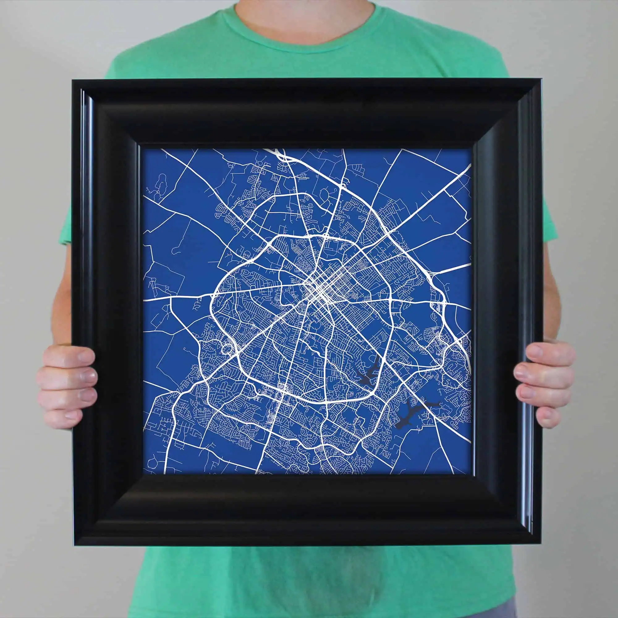 The size of this frame will vary depending on the size of the map you created. Frames are 16.5″ x 16.5″ for 12″ x 12″ prints and frames are 16.5″ x 20.5″ for 12″ x 16″ maps. Our frames have a black 2.75” wide heavy polystyrene molding. We choose to mount the prints without a glass/acrylic overlay, which shows off the unique properties of our paper stock when it hits the light. The back of the frame is sealed with a dust cover for added protection. Industrial silver hanging hardware is fixed to the back of the frame so it’s ready to hang on your wall.