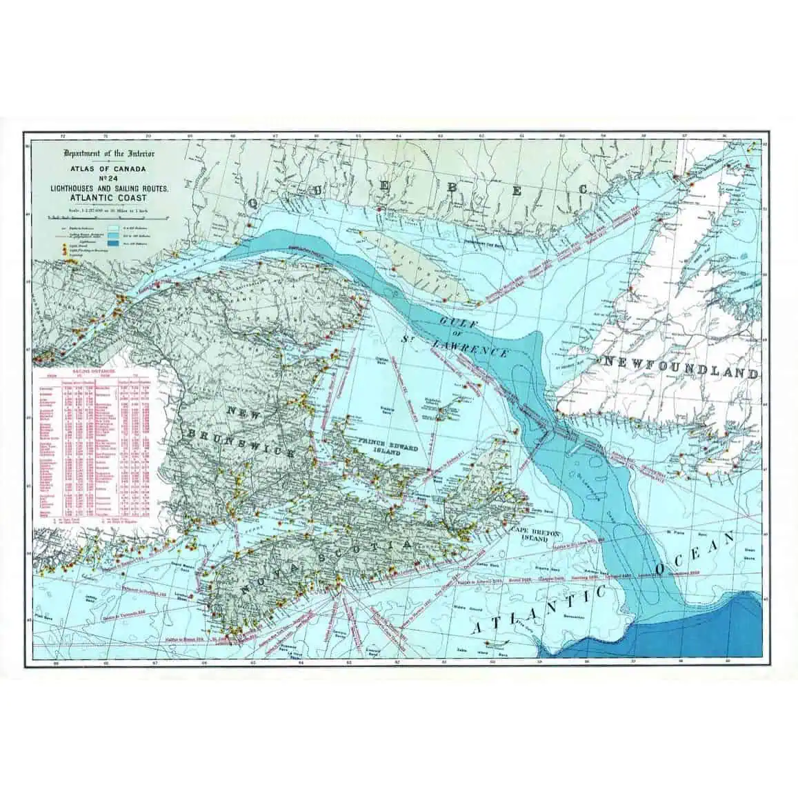 Contained within the 1st Edition (1906) of the Atlas of Canada is a map that shows the lighthouses and sailing routes on the Atlantic Coast. The map shows sailing routes and a table listing the distance, in miles, from Halifax, Montreal and Quebec to major ports. Although Newfoundland and Labrador was not a part of Canada in 1906, there is some data shown for this region. The lighthouses are distinguished between fixed, revolving lights, and light ships. The depth of water in the Great Lakes is indicated by contours and tints of blue. The deeper portions are shown in the darker tints, while lighter tints indicate more shallow waters. 24.25 x 17.25 in