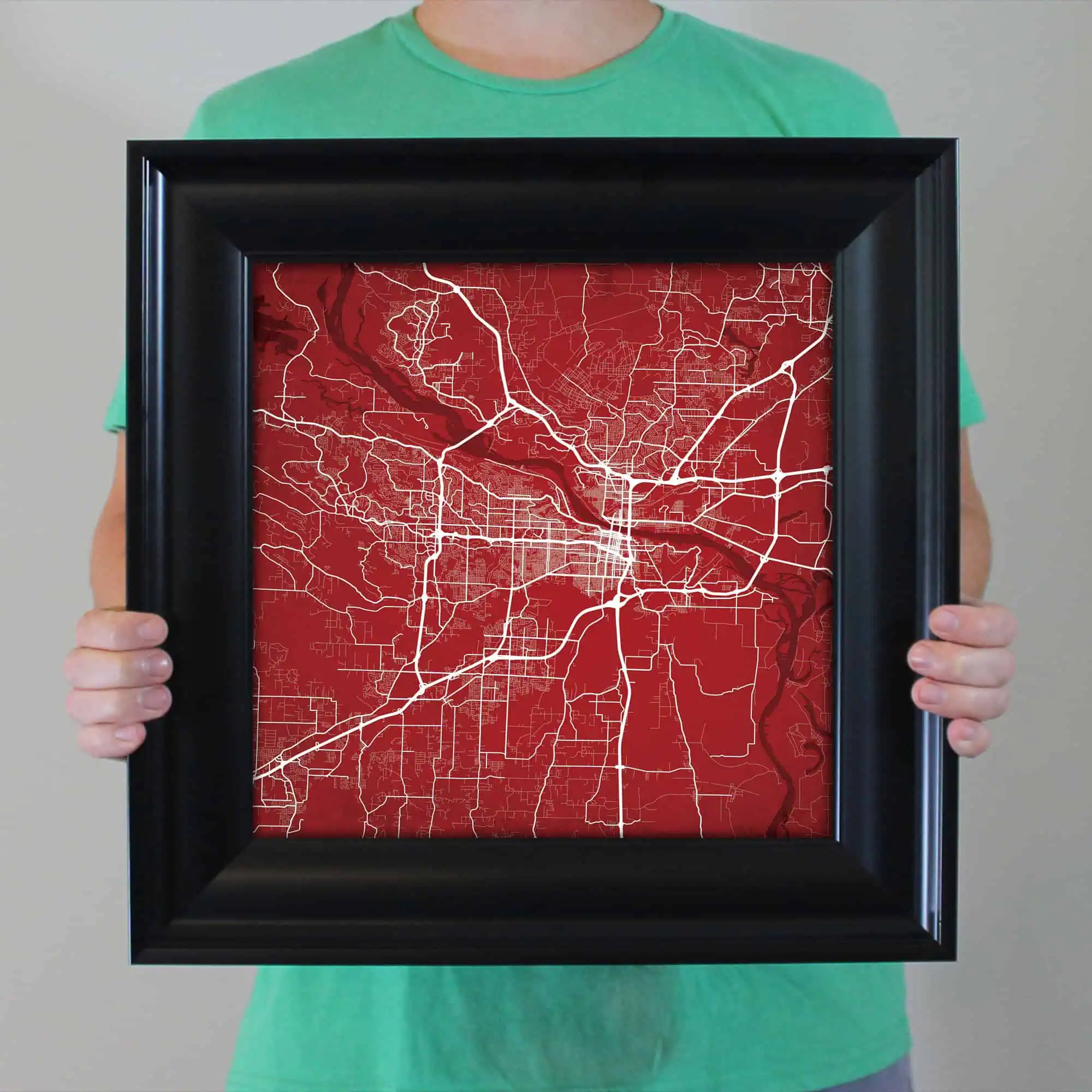 The size of this frame will vary depending on the size of the map you created. Frames are 16.5″ x 16.5″ for 12″ x 12″ prints and frames are 16.5″ x 20.5″ for 12″ x 16″ maps. Our frames have a black 2.75” wide heavy polystyrene molding. We choose to mount the prints without a glass/acrylic overlay, which shows off the unique properties of our paper stock when it hits the light. The back of the frame is sealed with a dust cover for added protection. Industrial silver hanging hardware is fixed to the back of the frame so it’s ready to hang on your wall.