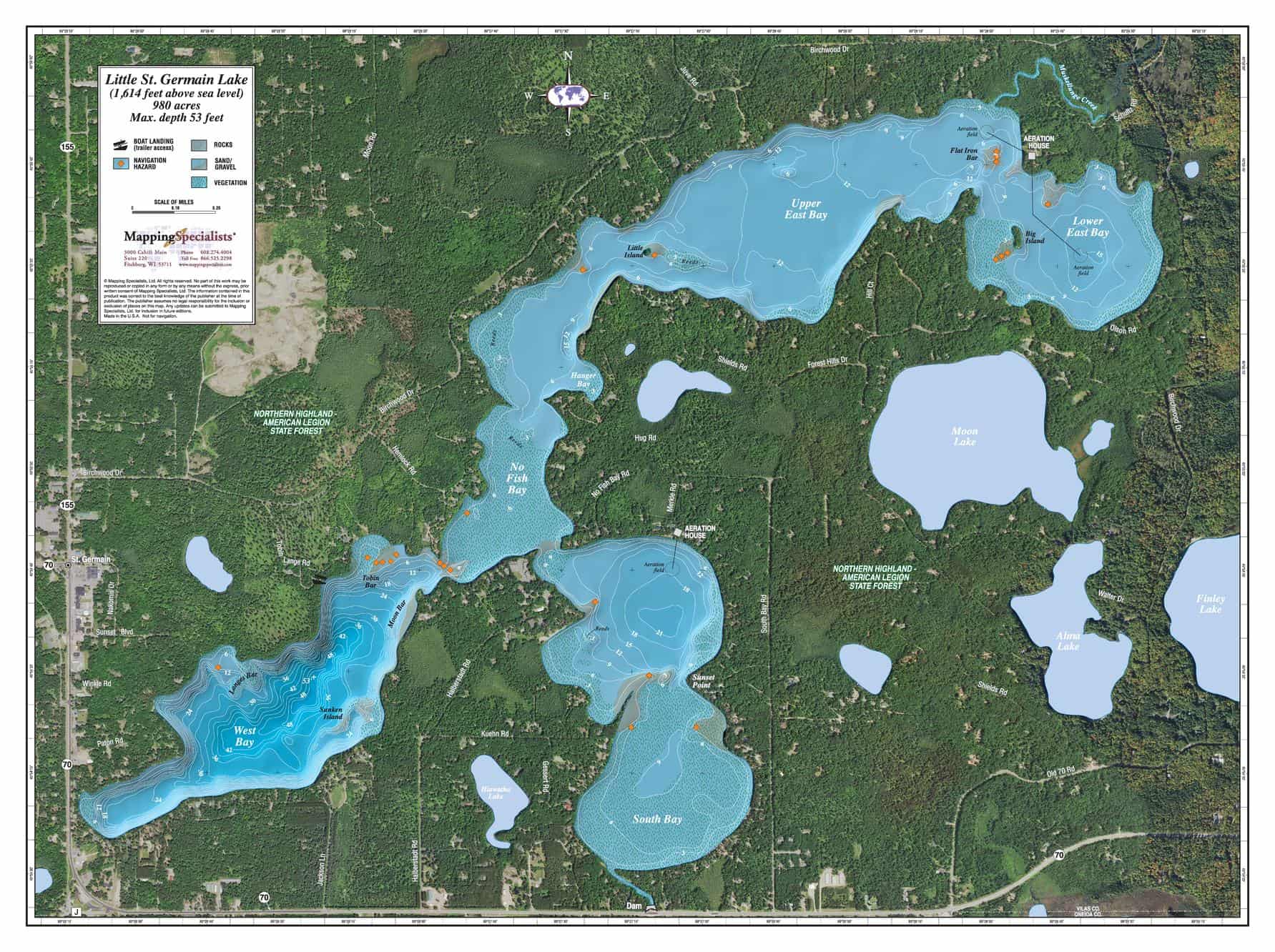 An Attractive map of the lake showing a visual 3D representation of the lake bottom. Includes boat launches, rock area and vegetation. Land area is high resolution aerial imagery.