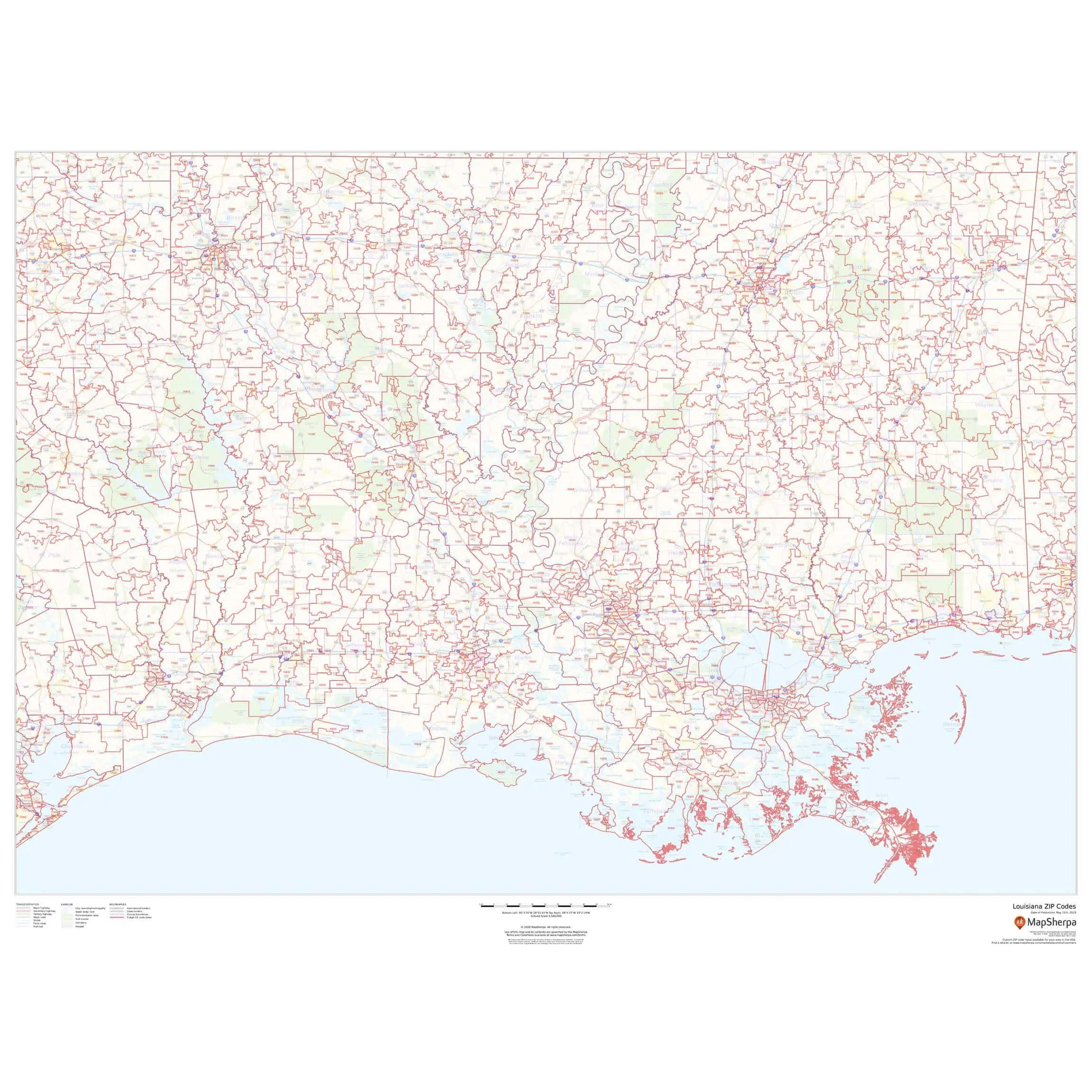 This map of Louisiana shows zip codes overlaid on a road map. Base map features include municipality and county boundaries, major road network features, and state and national parks and conservation areas.