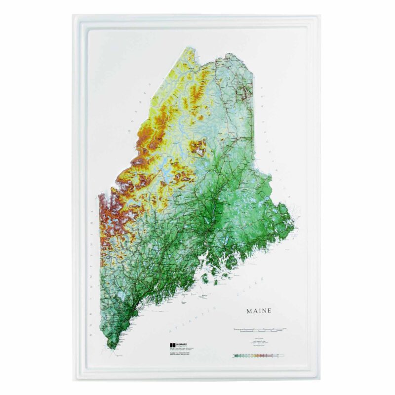 3D raised relief map of Maine with unframed dimensions of 32.5” x 22.5” This map is printed on 2mm thick high-grade rigid vinyl, then one of our technical artists heat-treats and vacuum-forms each individual print over our custom Maine mold. Showcase the northeastern-most U.S. state with a one-of-a-kind and fun to touch 3D raised relief map. It’s wall art, it’s a sculpture, and it’s a functional map!