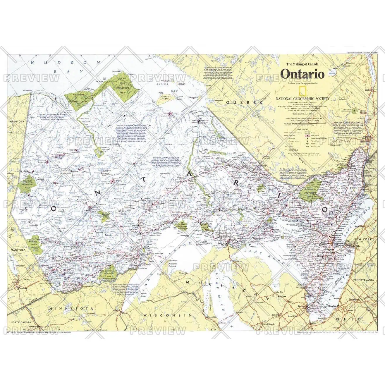 This map of Canada’s Ontario province contains a wealth of information. The richest, most populous, and most urban province, Ontario is also a land of uninhabited wilderness and vast mineral wealth. Published in June 1996 as part of the “Making of Canada” series.