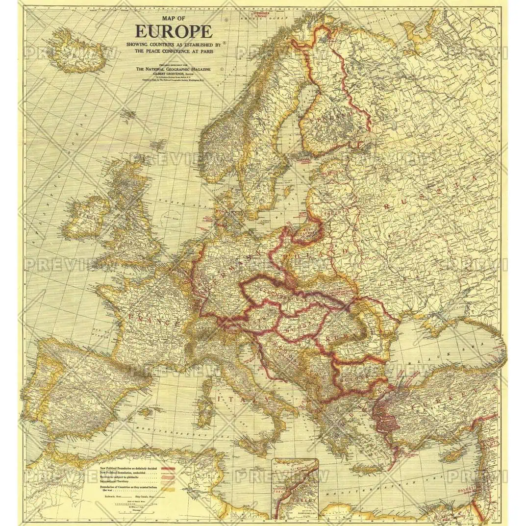 A must-have for history buffs, this map depicts Europe as established by the Peace Conference of Paris. New political borders, borders as they existed before World War I, international territories, and territories subject to plebiscite are detailed on this map which accompanied three articles on Europe in the February 1921 issue of National Geographic including “Czechoslovakia, Key-Land to Central Europe.”Â