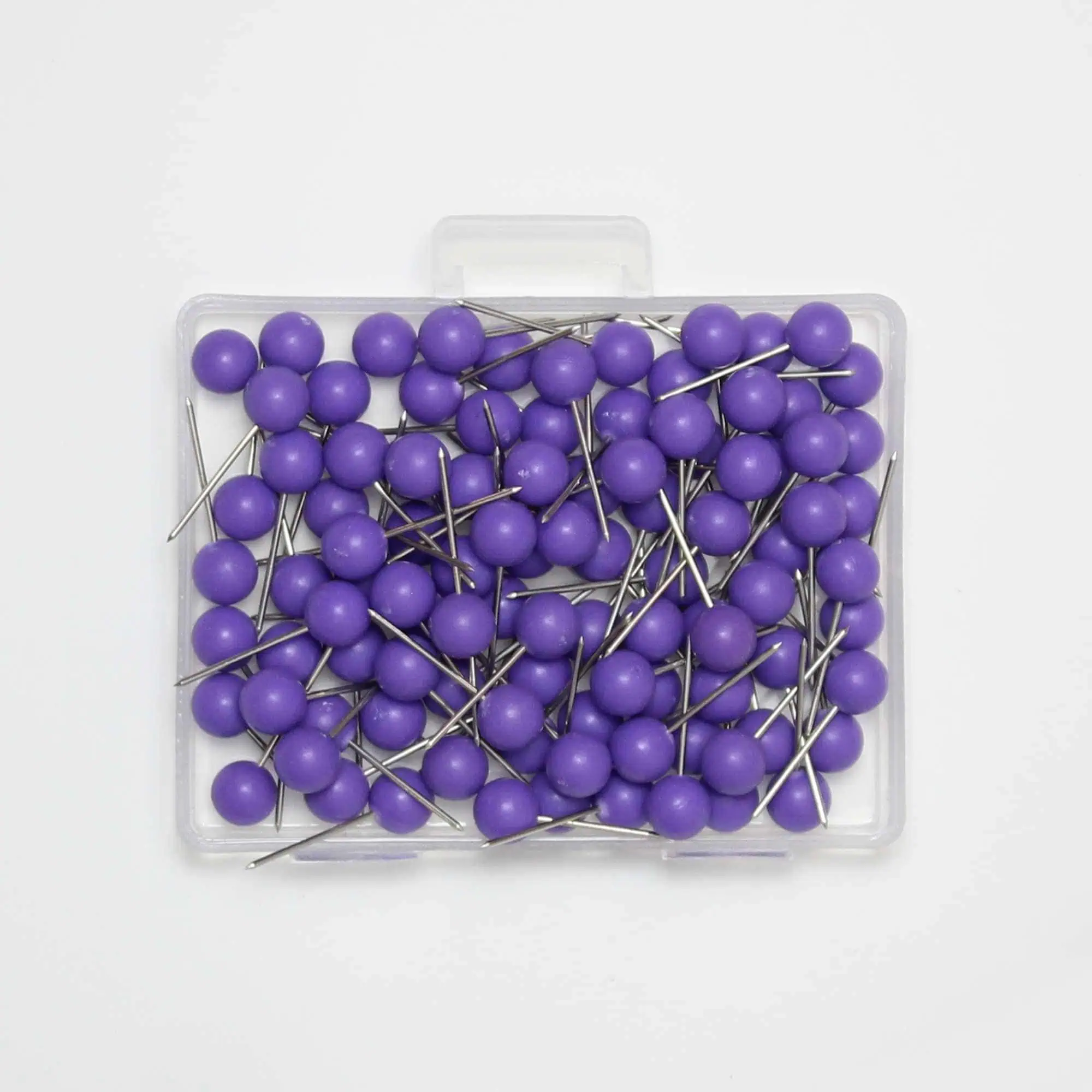Map tacks have round heads with sharp steel points. Each round pin head has a 3/16” diameter and is made of a hard plastic. A sharp steel pin extends from the pin head, making the entire pin 5/8” long. The map pins are conveniently packaged in break-resistant clear plastic box. The box has a strong clasp to ensure your pins won’t spill and the boxes are stackable for easy storage.