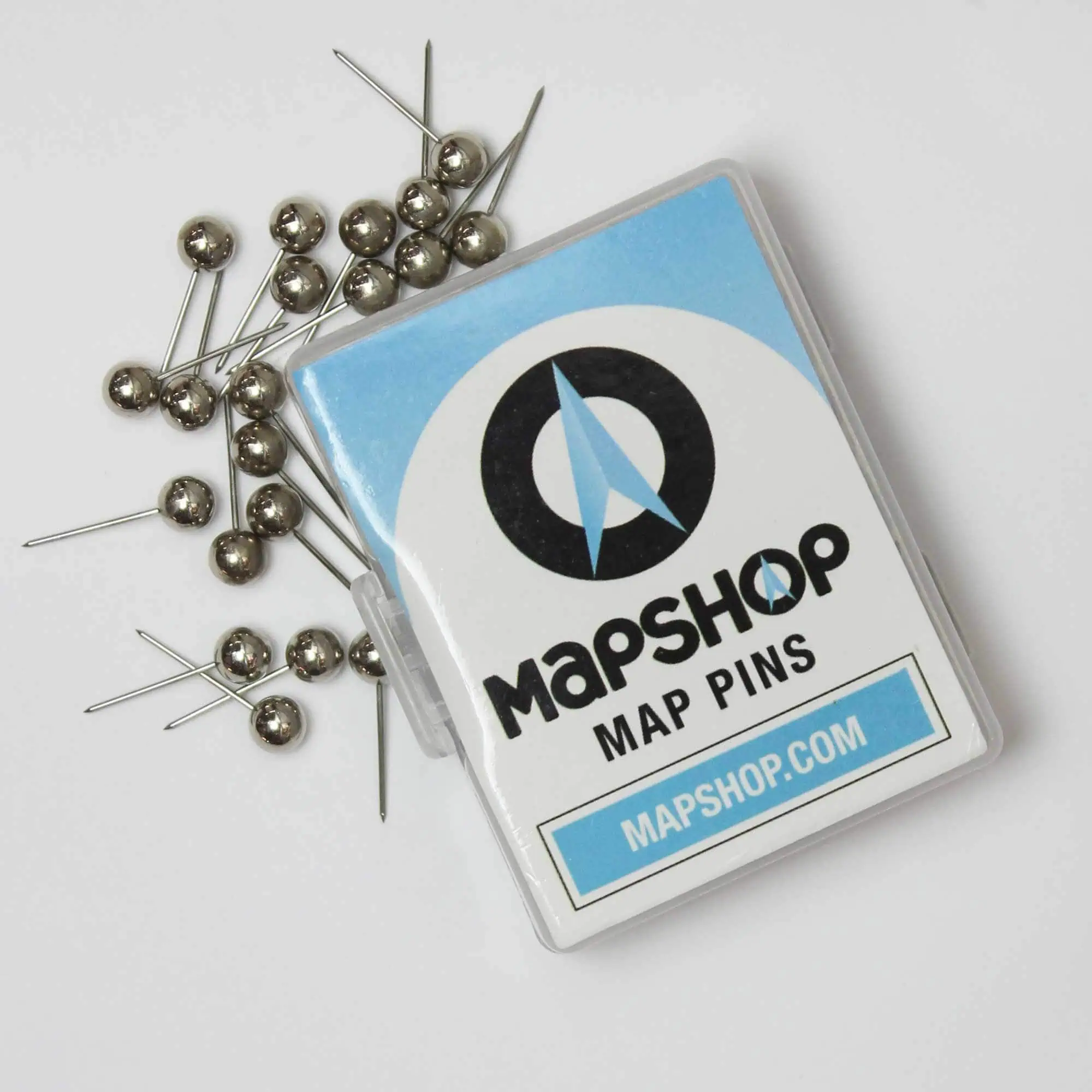 Create your own interactive pin map with our Map Shop branded map tack push pins. Travelers can pin their past travel or future adventures and business can plot locations of important assets, leads, or opportunities. All our framed or mounted WALL MAPS are finished with a foam core backing, which can be used with these map pins.
