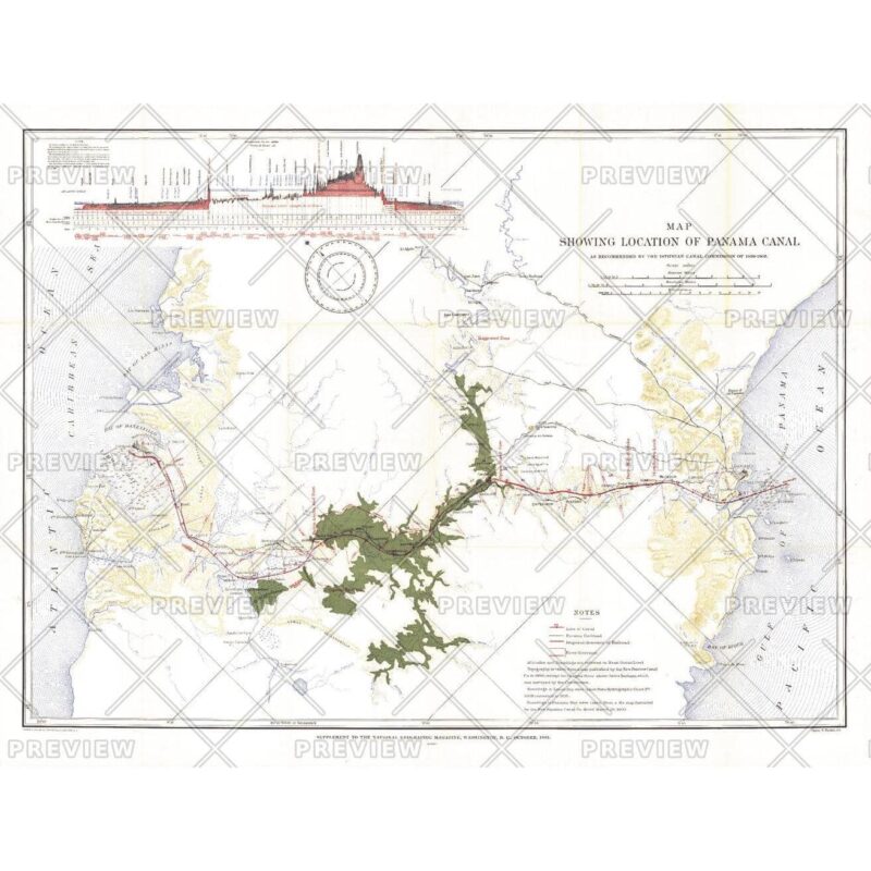 The “Map Showing Location of Panama Canal, as Recommended by the Isthmian Canal Commission of 1899-1902” is a unique historical piece published in October 1905 with three articles on canals. One of the largest engineering projects ever undertaken, the famed canal linking the Atlantic and Pacific oceans was completed in 1914. This map makes a fine companion for the “Birds-eye View of the Panama Canal” map printed in 1912.