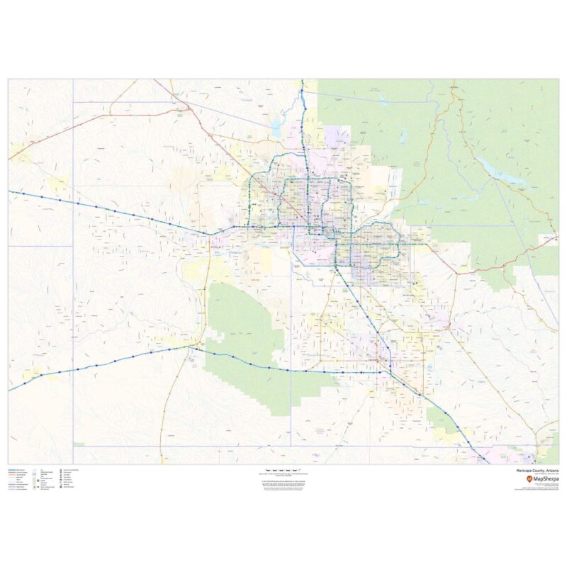 This map of Maricopa County, Arizona shows regional level information. Base map features include highways and major roads with labelling; high level land use such as parks and recreation areas; and a selection of points of interest including transportation hubs like airports and train stations, tourist information and police stations.