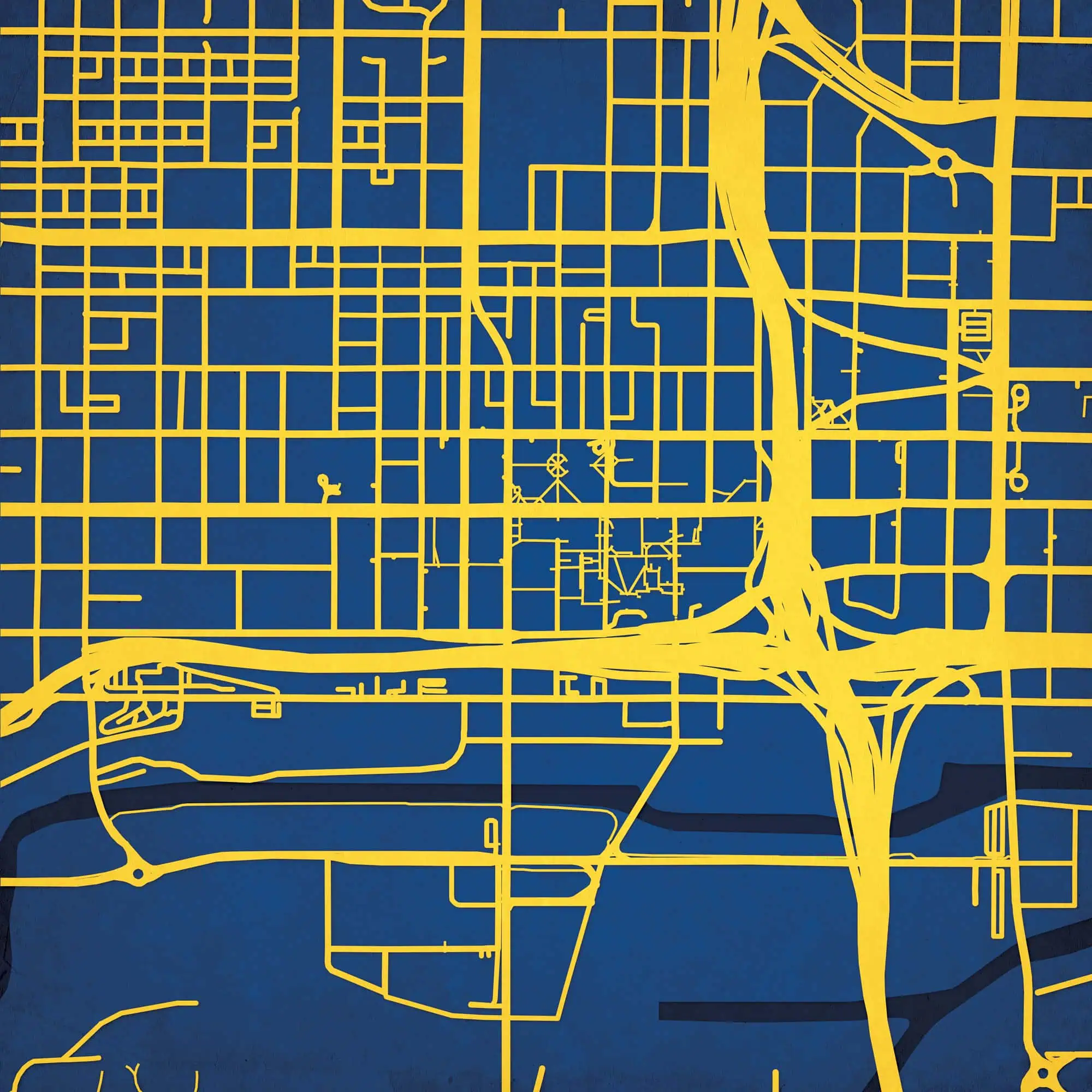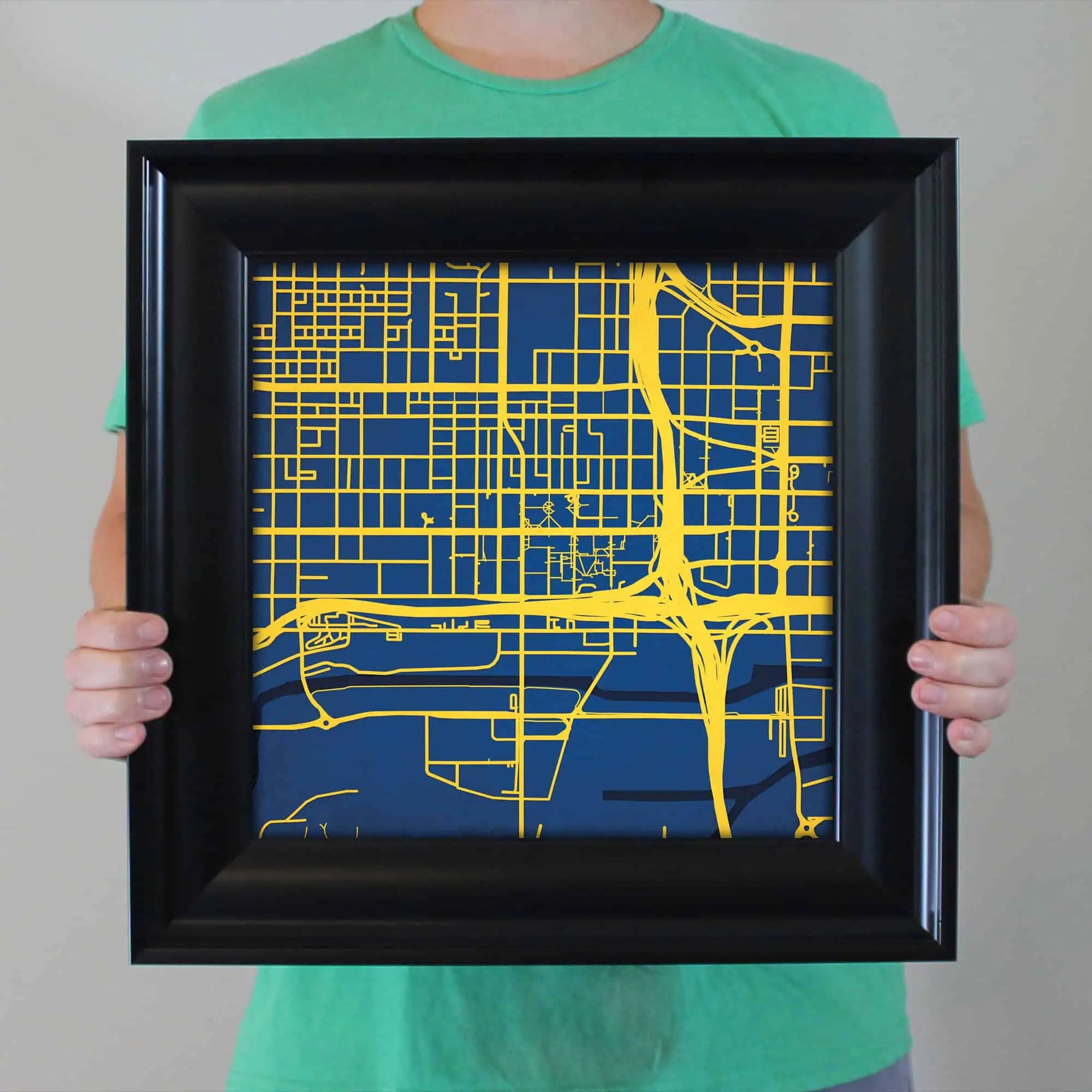Colorful city map wall art featuring prominent street layouts and urban design, perfect for home or office decor, highlighting city navigation and geographic features.
