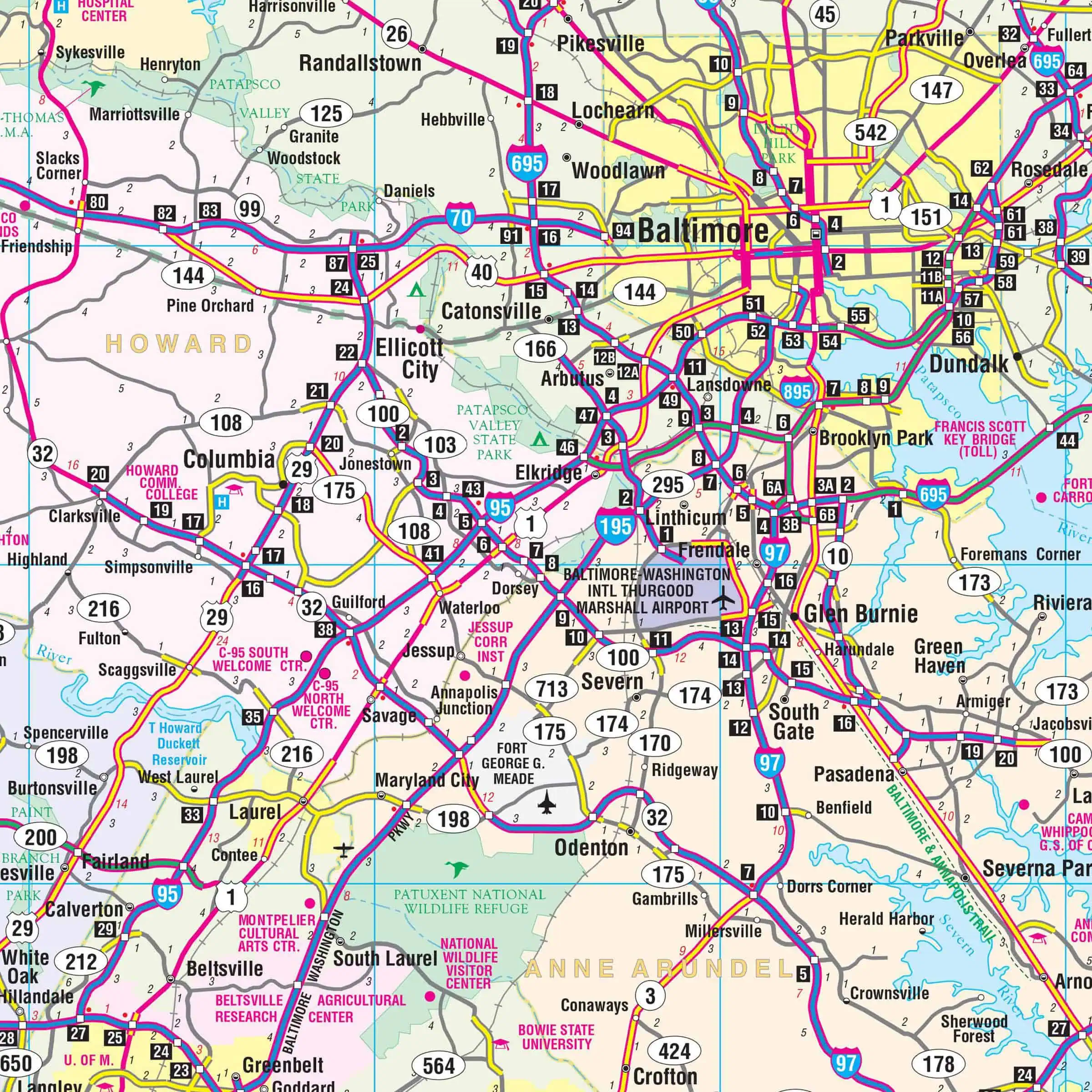 Along the bottom and left side of the map, extensive indices list cities and towns, along with a grid locator to facilitate easy referencing. Additional insets provide detailed views of major urban areas, including Baltimore, Washington D.C., and the Wilmington area, allowing for closer examination of these densely populated regions.