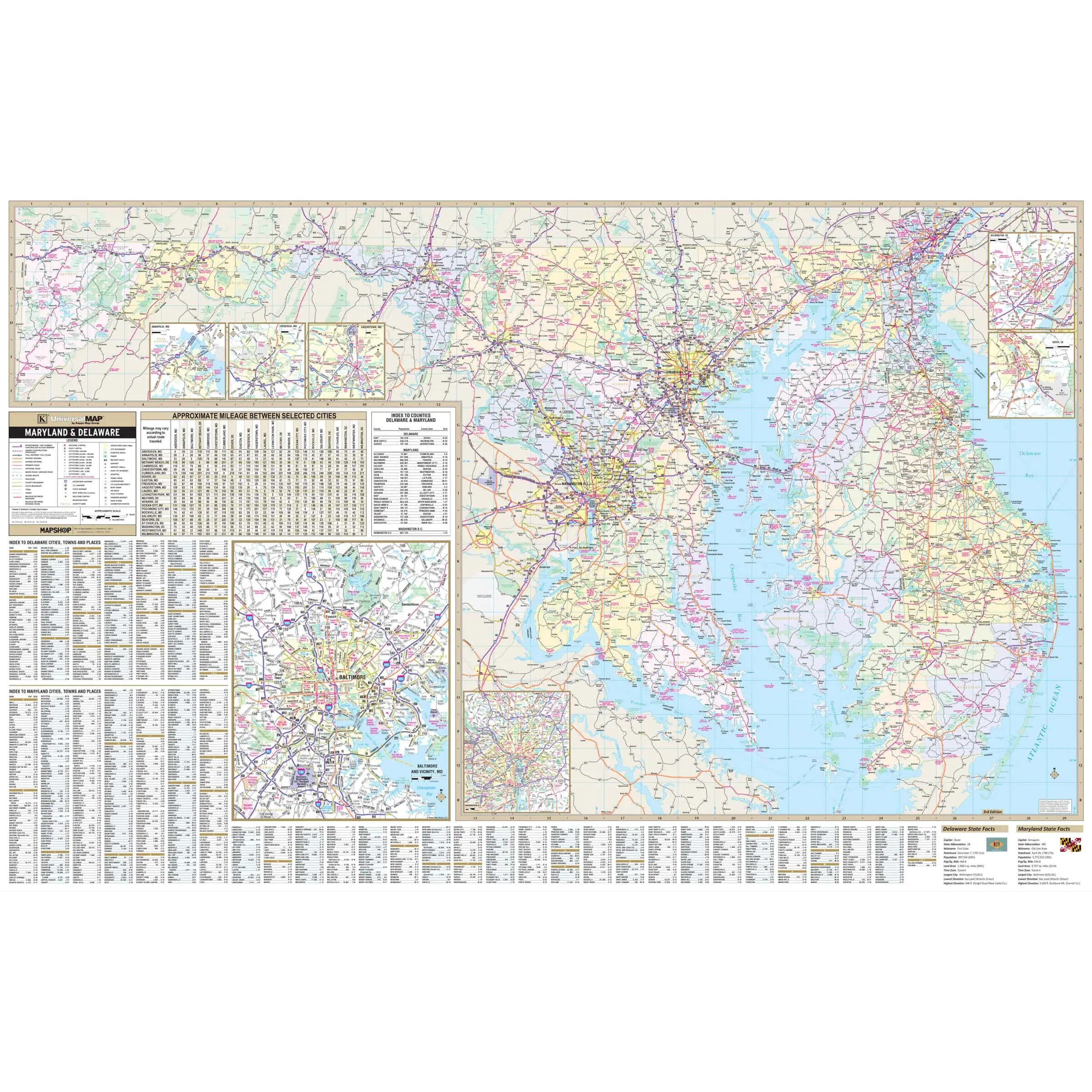 A separate inset displays the entire state of Delaware for a broader perspective, and a mileage chart offers a quick reference for distances between major points. This map is a practical resource for anyone needing to navigate or understand the geographical and infrastructural layout of Maryland and Delaware, serving diverse needs from travel planning to educational applications.