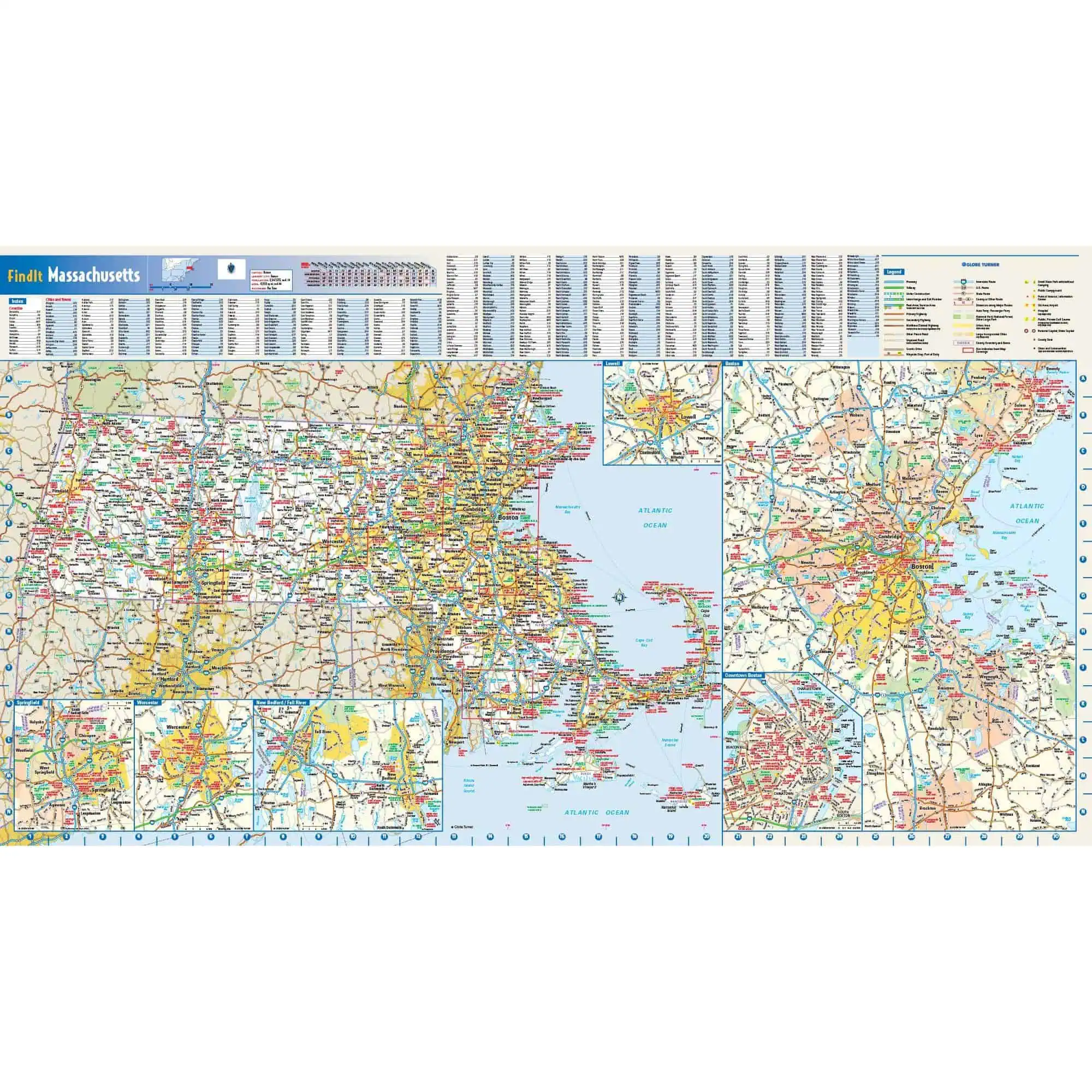 This colorful, easy-to-read state map of Massachusetts identifies all major thoroughfares, secondary roads, freeway interchanges, rest areas, distance markers, landmarks, recreational areas, and more. Shaded relief on the state map provides a three-dimensional sense of Massachusetts’ topography. Detailed inset maps of Boston, Lowell, New Bedford/Fall River, Springfield and Worcester are based on the latest street information from our cartographic experts. County and city indices make it simple to locate even the smallest town.