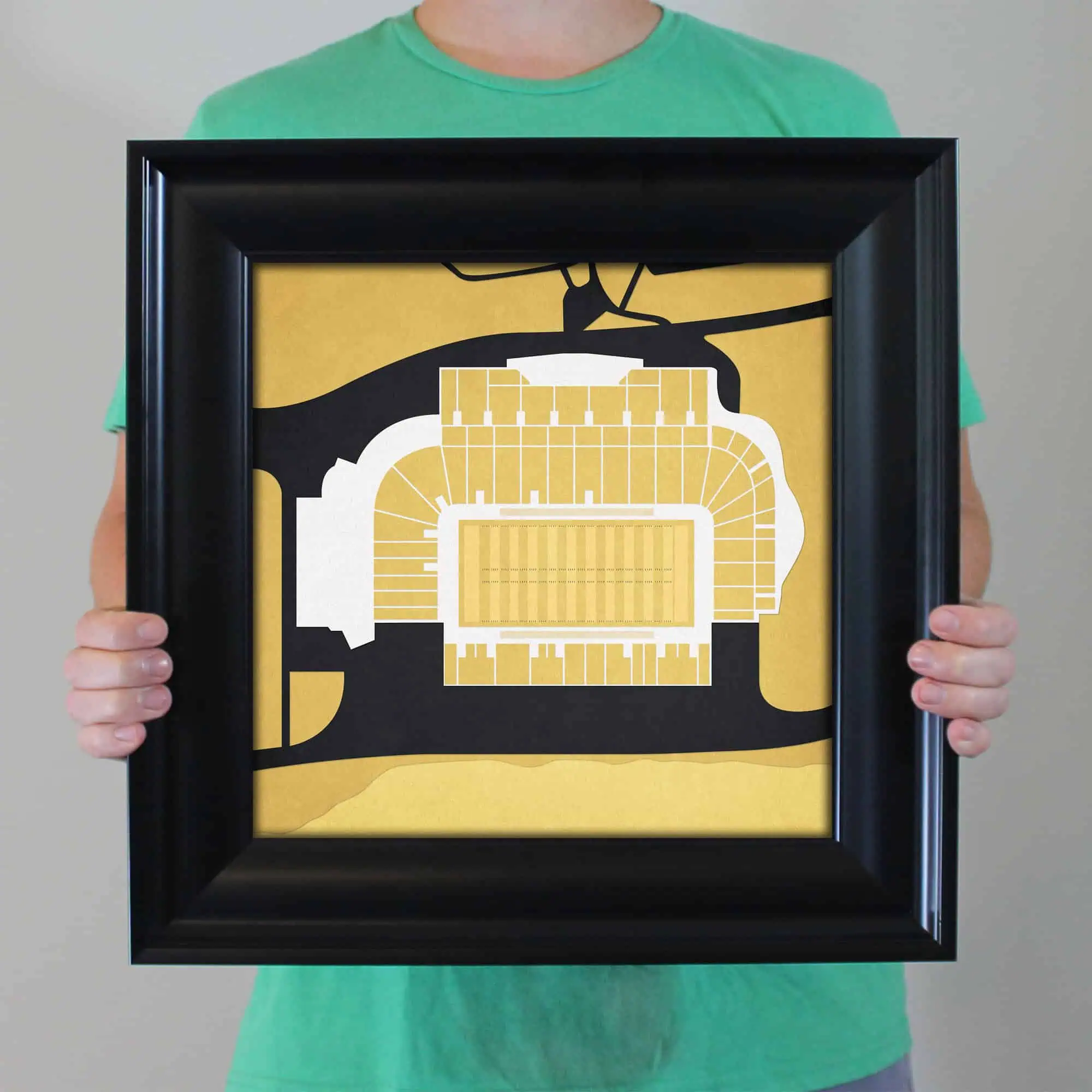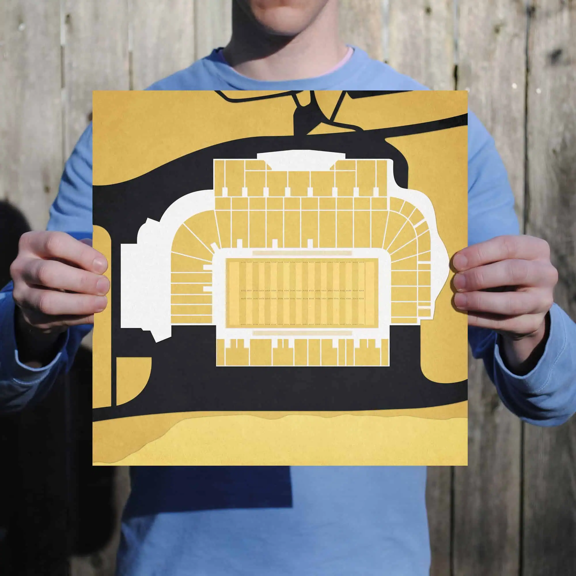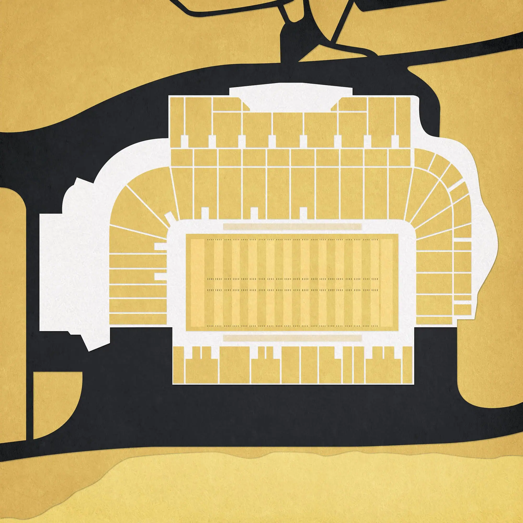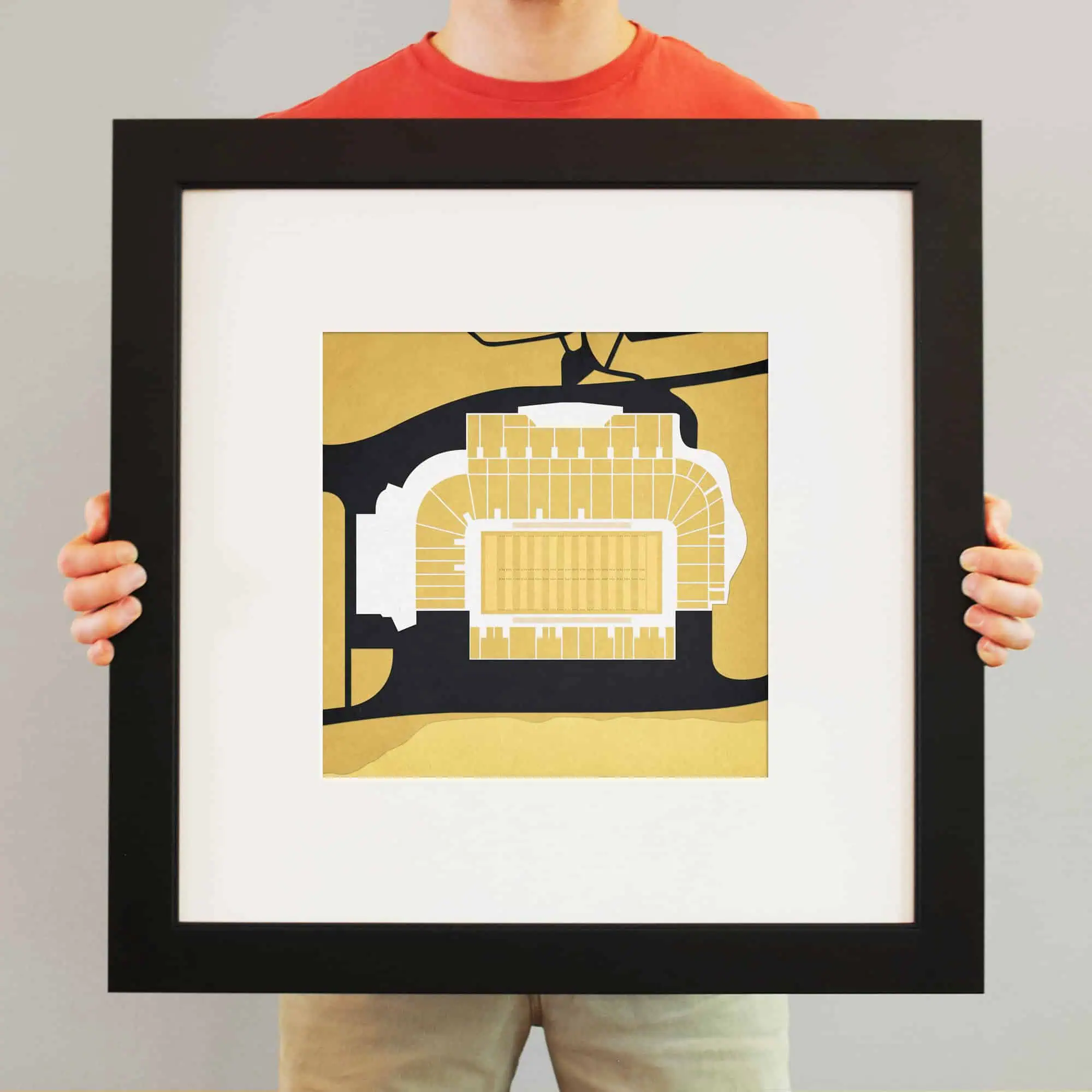 Map art print including the aerial view of Michie Stadium located at United States Military Academy in West Point, New York.