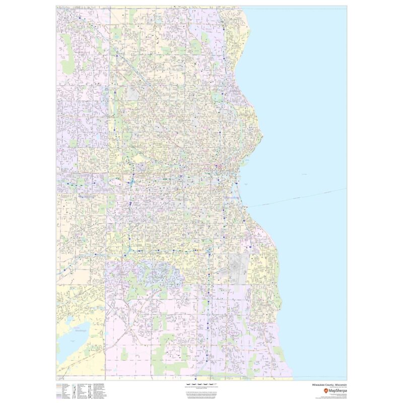 This map of Milwaukee County, Wisconsin shows street level information including street labeling. Base map features include all roads with major roads and highways labelled; neighborhood names; railways; high level land use such as parks and recreation areas, industrial areas and hospital campuses; and a variety of points of interest including libraries, stadiums, museums, border crossings and more. zip code boundaries are shown as a secondary map feature.