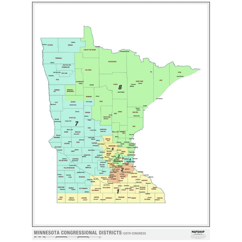 Minnesota has 8 congressional districts. This map shows exactly where each one starts and ends – with county lines, county seats, the state capital, and metro and micropolitan centers all layered in for geographic context.